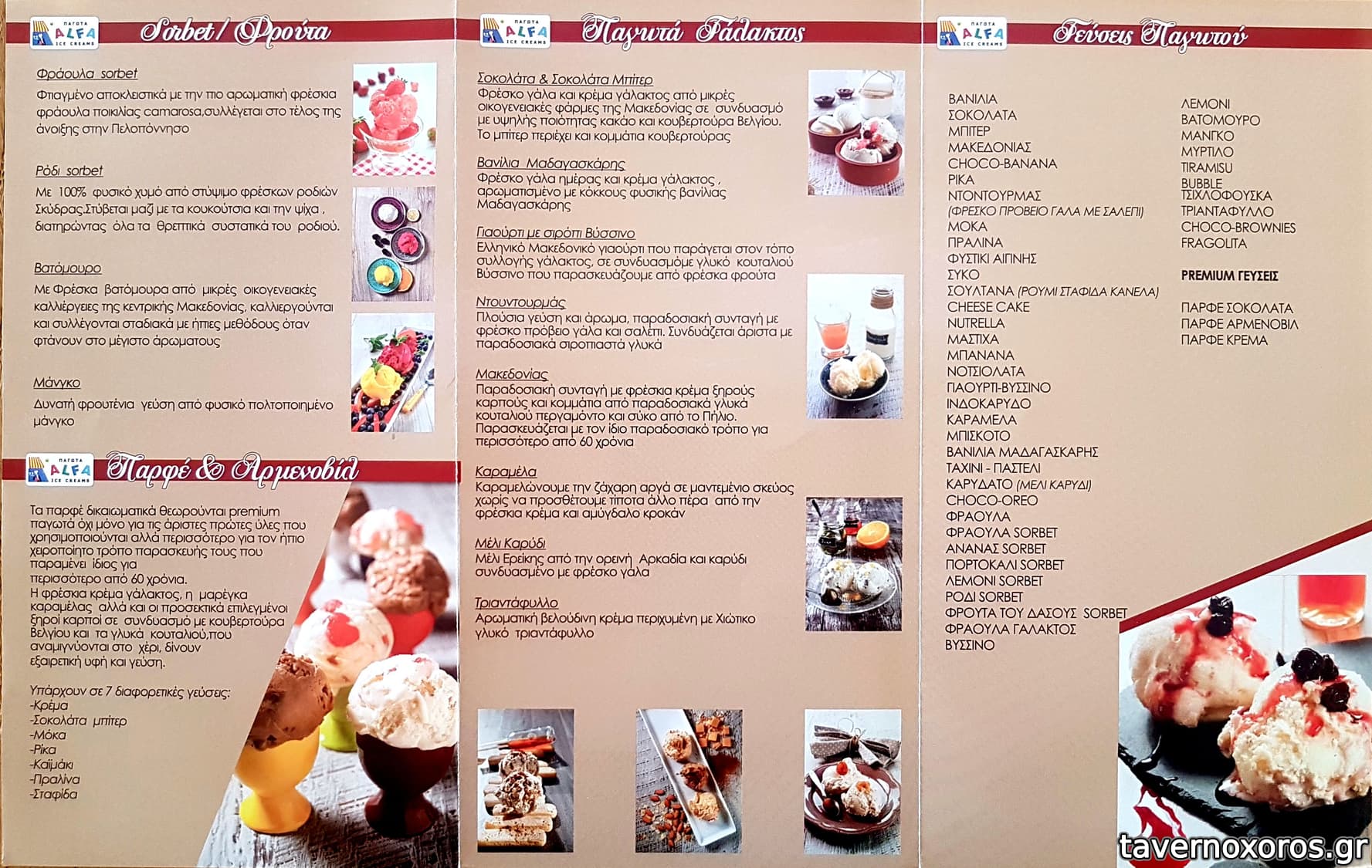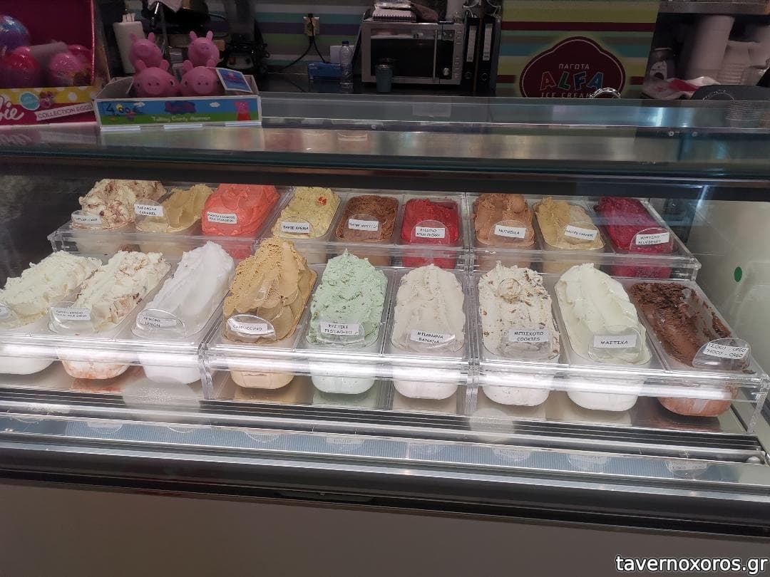 Όντως το παγωτό τους βγάζει κάτι διαφορετικό από τα υπόλοιπα. Νομίζω ότι η γλυκητητα του είναι που το κάνει να ξεχωρίζει. Τα περισσοτερα παγωτά τείνουν να έχουν μια πιο flat γεύση τώρα τελευταία. Αυτό με μια κουταλιά σε χτυπάει η γευση και η γλυκά κατευθείαν. Προμηθεύει με παγωτό απ ότι έχω παρατηρήσει αρκετα μαγαζιά (ψυγείο με το σήμα alfa) . Είμαι περίεργος να δοκιμάσω από κάποιο από αυτά να δω αν η γεύση συγκρίνεται με το κεντρικό κατάστημα.