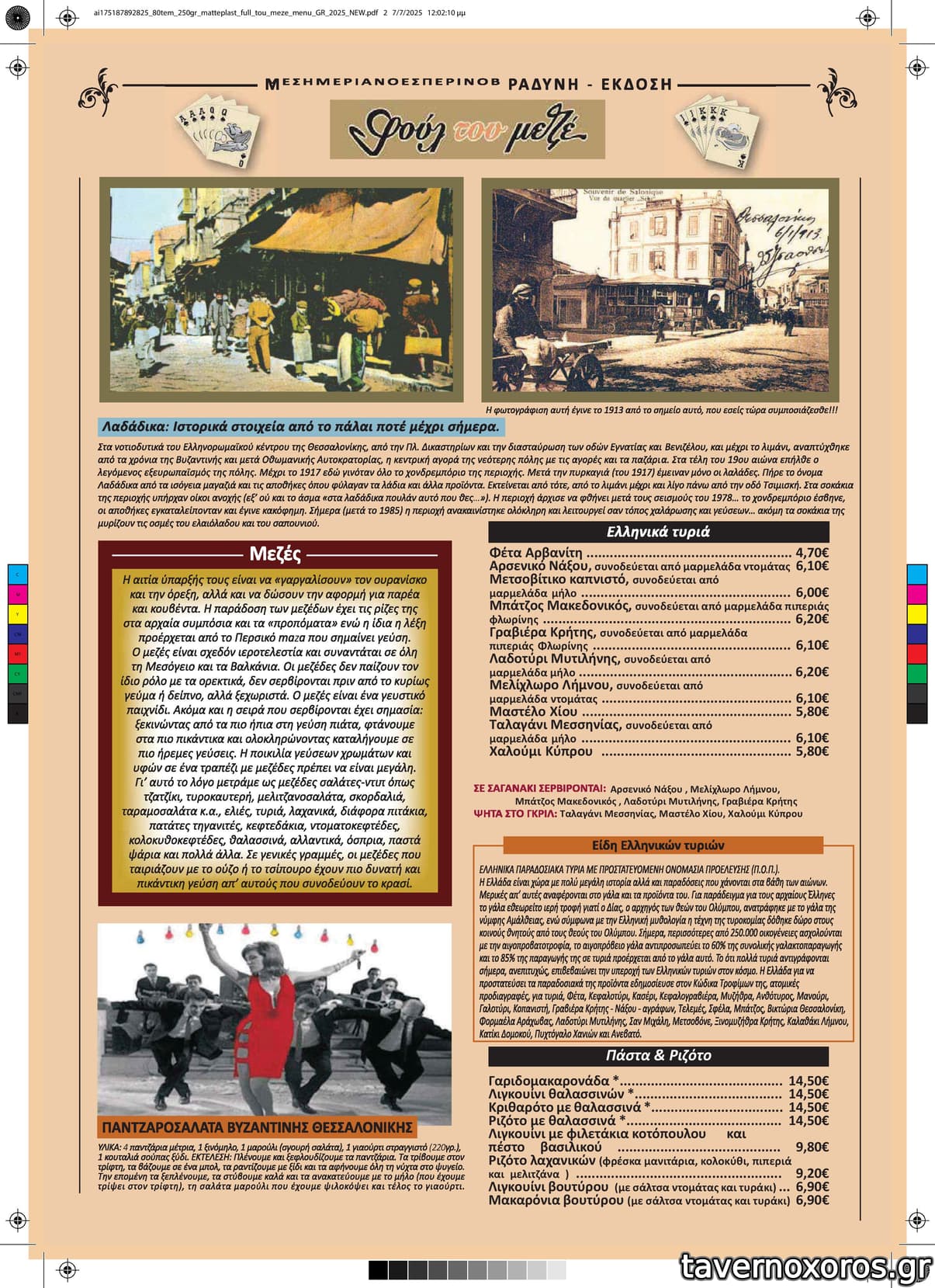 | Λέξεις κλειδιά | Full του Μεζέ, Λαδάδικα, #πλατεία, #πεζόδρομος, #ντολμαδάκια, #σταμναγκάθι, #γαύρος μαρινάτος, #μετσοβόνε, #μπάτζος, #κομός, #αρσενικό, #μαστέλο, #χαλούμι, #αθότυρος, #λαδοτύρι, #μελίχλωρο, #μανούρα, #ομελέτα, #παστουρμάς, #καβουρμάς, #σουτζούκι, #απάκι, #σύγλινο, #φασόλια γίγαντες, #ρεβυθάδα, #μανιτάρια, #κολοκυθοκεφτέδες, #κολοκυθοανθοί, #μαραθοτηγανίτες, #πιταρούδια, #σουγάνια, #γεμιστά κρεμμύδια, #παστουρμαδόπιτα, #συκωτάκια πουλιών, #κεφτεδάκια, #σουτζουκάκια, #μπιφτεκάκια, #τηγανιά, #λουκάνικο, #χοιρινή, #μοσχαρίσια σπαλομπριζόλα, #κοτόπουλο, #γκιούλμπασι, #χουνκιάρ μπεγεντί, #τσουμπλέκι, #χταπόδι, #μύδια, #γαρίδες, #γάμπαρη, #μυδοπίλαφο, #γαύρος, #σαρδέλα, #μπακαλιάρος σκορδαλιά, #γαλέος, #γαριδομακαρονάδα, #σουπιές |