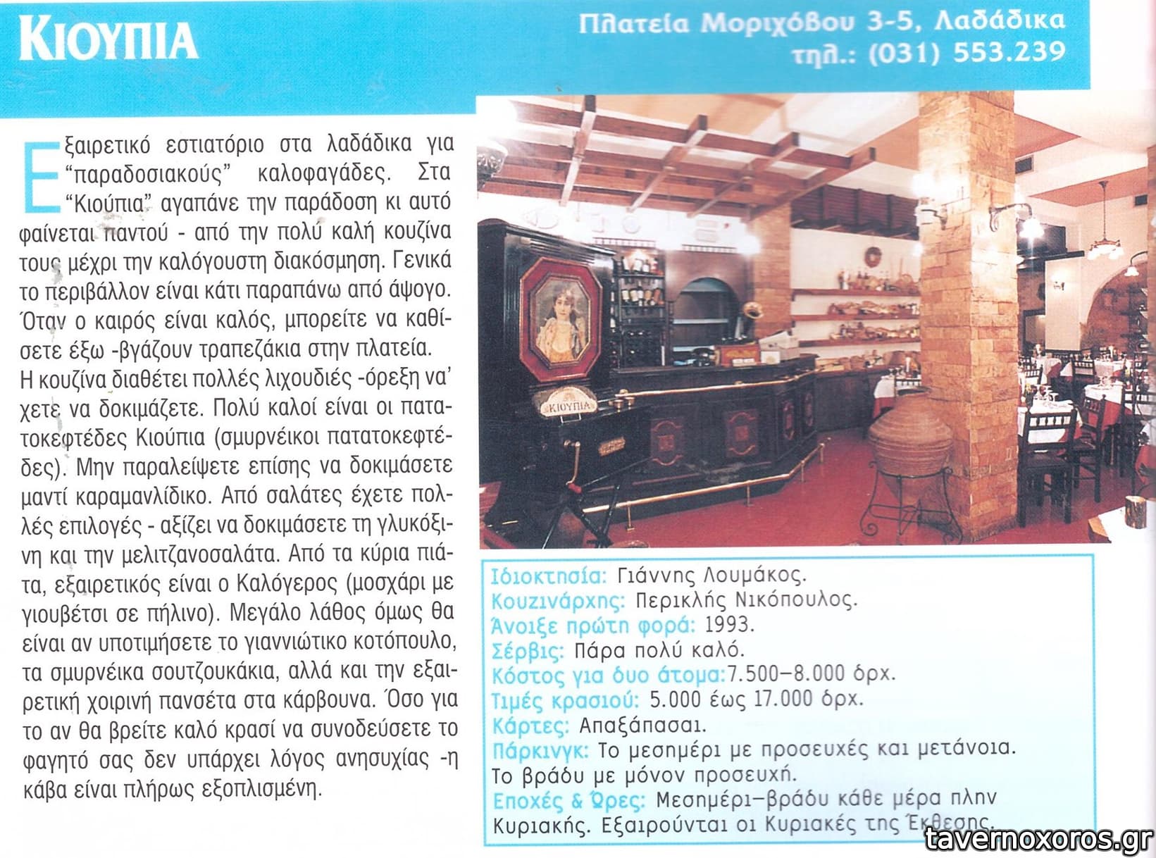 Έτυχε πριν 2-3 Σάββατα να βρεθώ και εγώ στα Κιούπια. Δεν το κρύβω ότι ήμουν αρκετά προκατειλημμένος από τα σχόλια που είχα διαβάσει εδώ γύρω (μέγας φαν του Ταβερνοχώρου). Η εξαιρετική βραδιά στο συγκεκριμένο μαγαζί διέλυσε όλες τις αμφιβολίες που είχα πριν πάμε. Εξαιρετικό σέρβις (ταχύτατοι και πολύ φιλικοί), νοστιμότατο φαγητό, από τις σαλάτες (Η Σαντορινιά απλά τα σπάει) μέχρι το επιδόρπιο και χρέωση που δεν θυμίζει σε τίποτα Λαδάδικα και εστιατόριο πολυτελείας. Κερασάκι στην τούρτα η live μουσική που έδινε έναν πιο ζωντανό τόνο στη διάρκεια του γεύματος. Από ότι μου είπαν δεν έχει πολύ καιρό που τα Σ/Κ υπάρχει ζωντανή μουσική. Εν κατακλείδι, το προτείνω ανεπιφύλακτα !