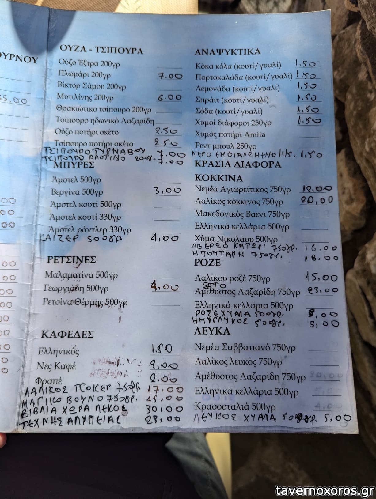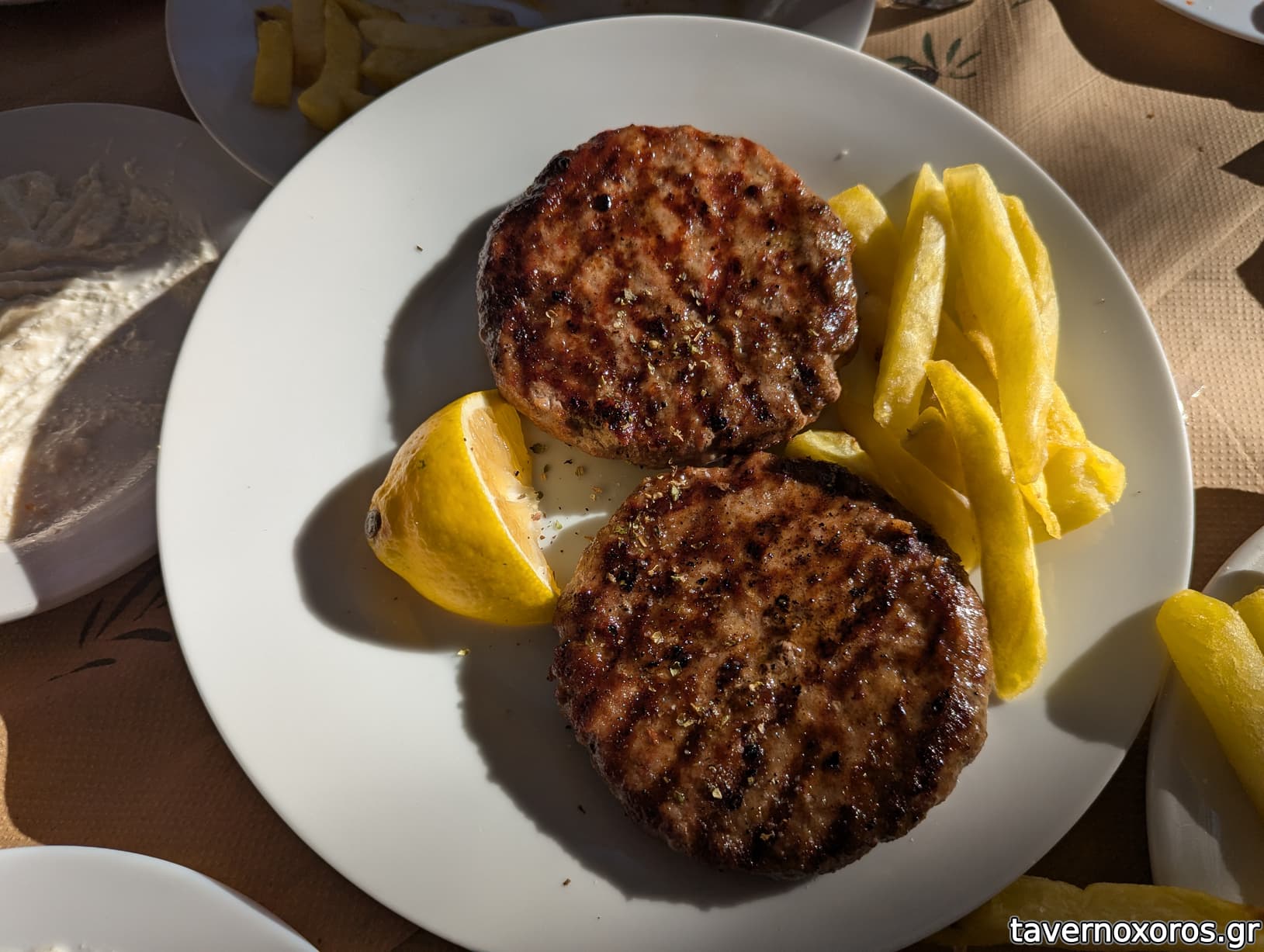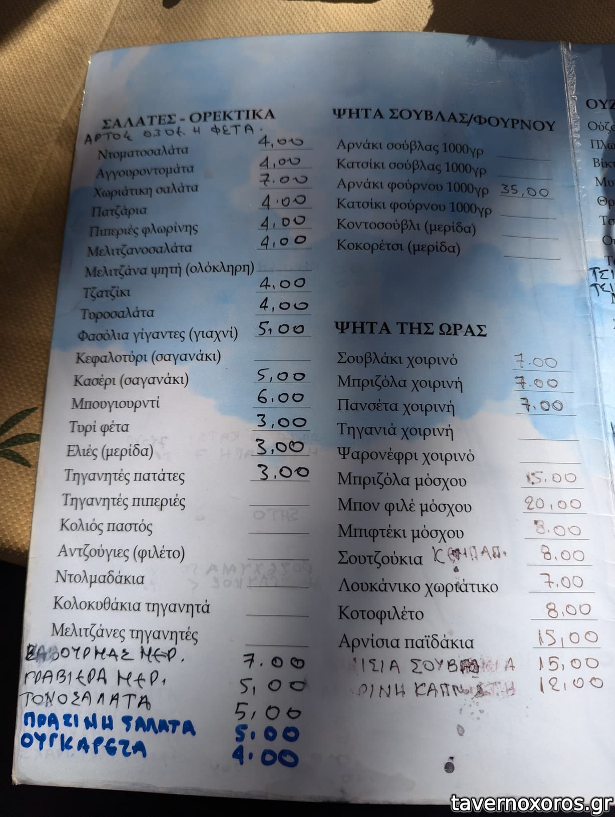 Από τον κατάλογο έλειπαν κάμποσα πιάτα, ούτε είχε σούβλες. Δυστυχώς το φαγητό πολύ κάτω του μετρίου, σχεδόν τα πάντα ετοιματζίδικα. Φαγητό που ψυχολογικά είμαι έτοιμος να υποστώ σε καμένο καφενείο ή παραθαλάσσια τουριστική ταβέρνα με κίονες και συρτάκι, έφαγα αναπάντεχη σφαλιάρα από τίμιο ταβερνάκι χωριού. Ξεχώρισα μόνο τα σουβλάκια (χοιρινό & αρνίσιο).