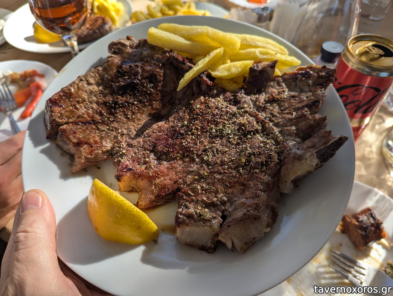 Μοσχαρίσια μπριζόλα (χάλια, δεν τρωγόταν λόγω κακής πρώτης ύλης και κακού ψησίματος, ευτυχώς είχε τριγύρω πολλά γατιά και σκυλιά και δεν πήγε άπατο)