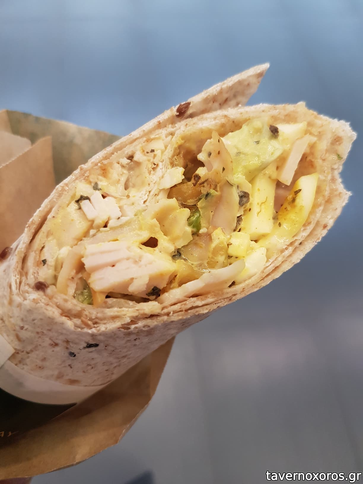 Τορτίγια ολικής με γαλοπούλα, γκούντα, μήλο, φέρσκο βασιλικό, iceberg" (απλώς οκ)