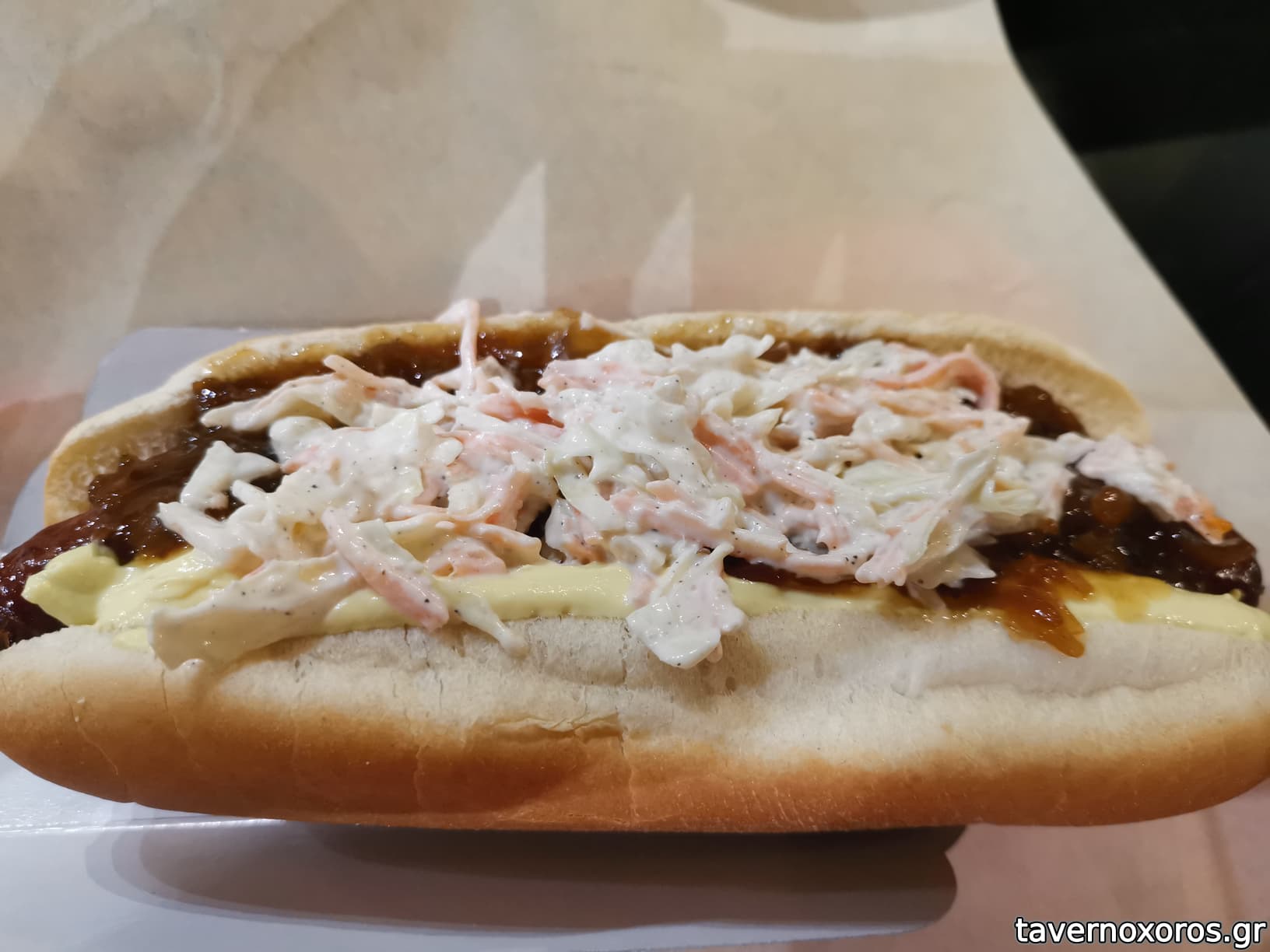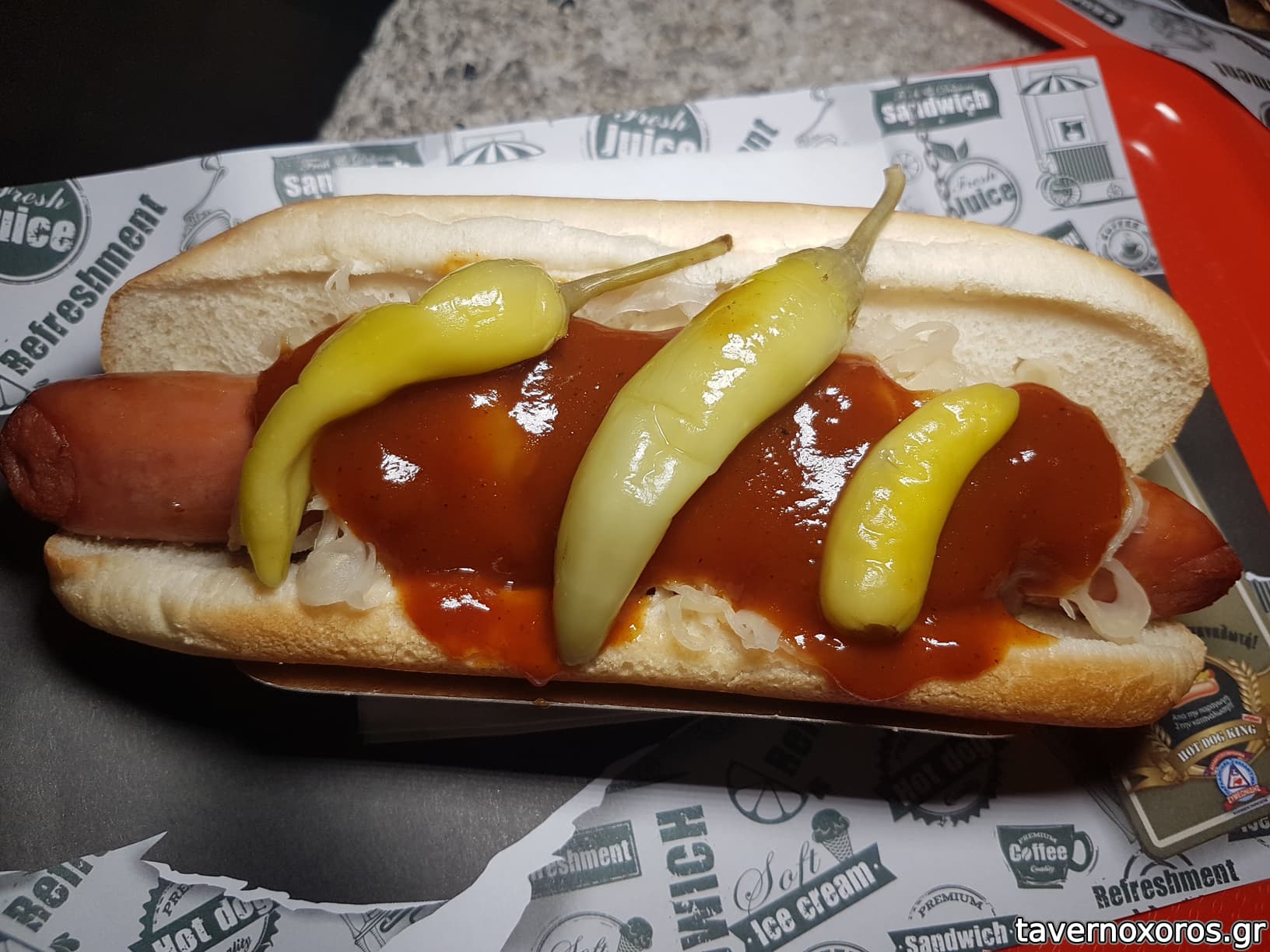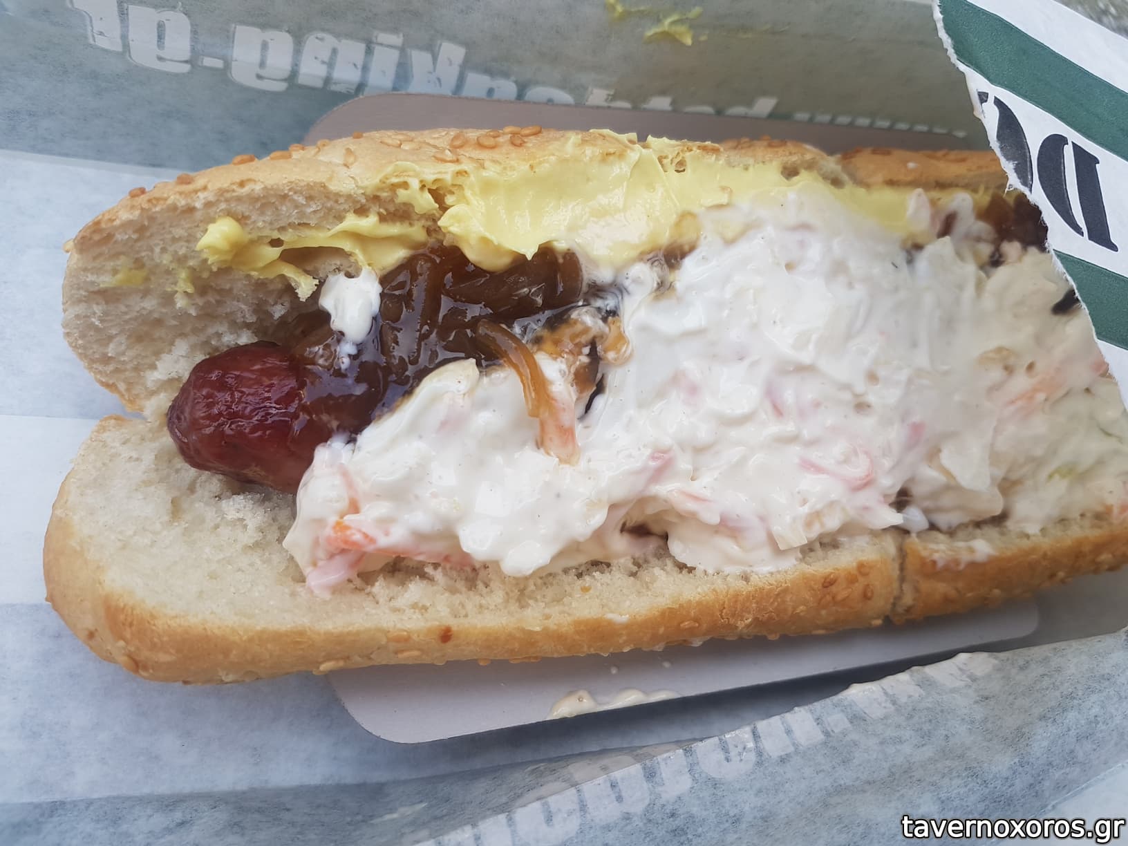 Πήγα και δοκίμασα ένα μοσχαρίσιο hot dog με καραμελωμένα κρεμμύδια και ξινολάχανο, όπως σύστηναν οι συνάδελφοι ταβερνοχωρίτες στα σχόλια στο cosmos. Δε λέω, καλό, αλλά: