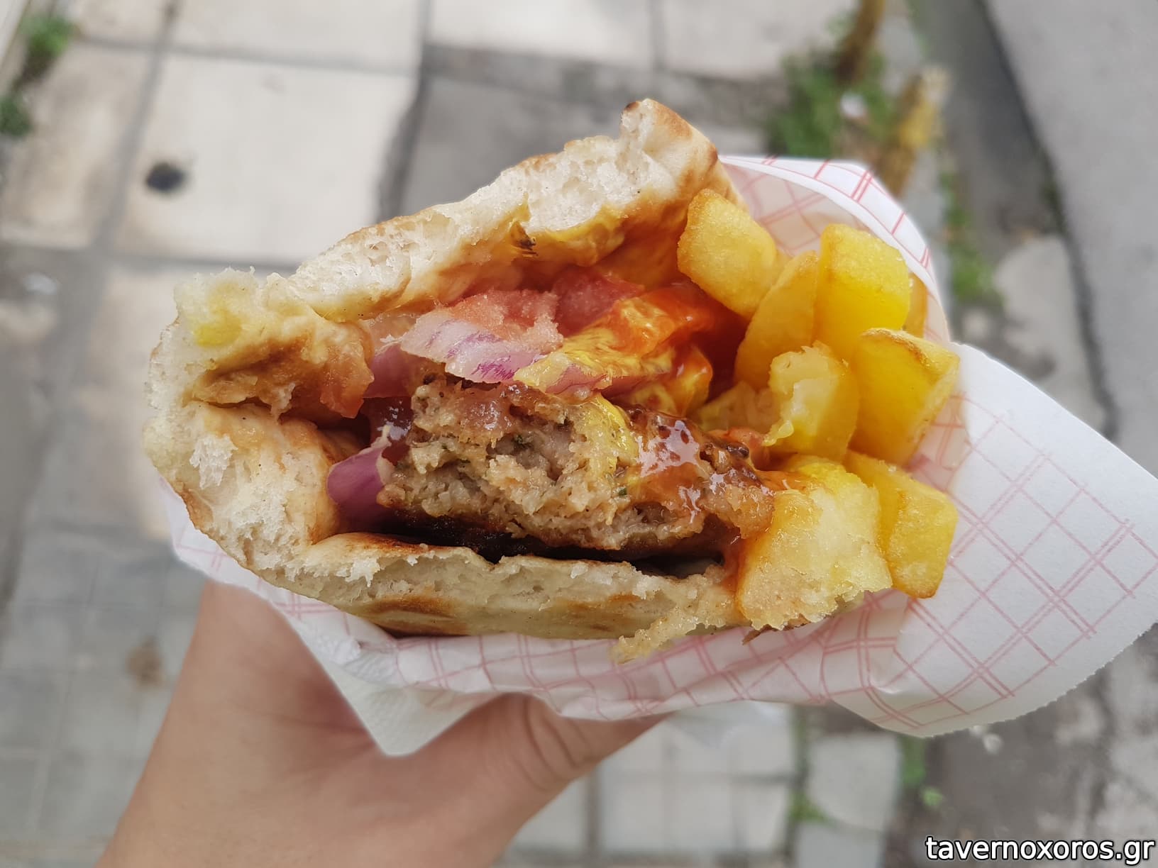 Γράφει εξωτερικά "ήρθε το σουτζουκάκι Περαίας" (Μάιος 2013).