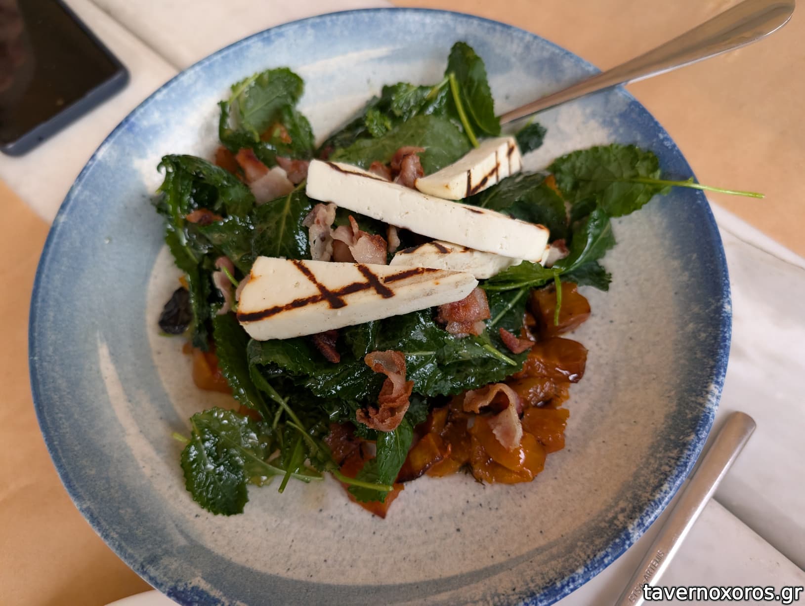 "Ψητή κολοκύθα με φύλλα κέιλ, μανούρι, καπνιστή πανσέτα, αποξηραμένα φρούτα και ντρέσινγκ πετιμέζι" (καλή)
