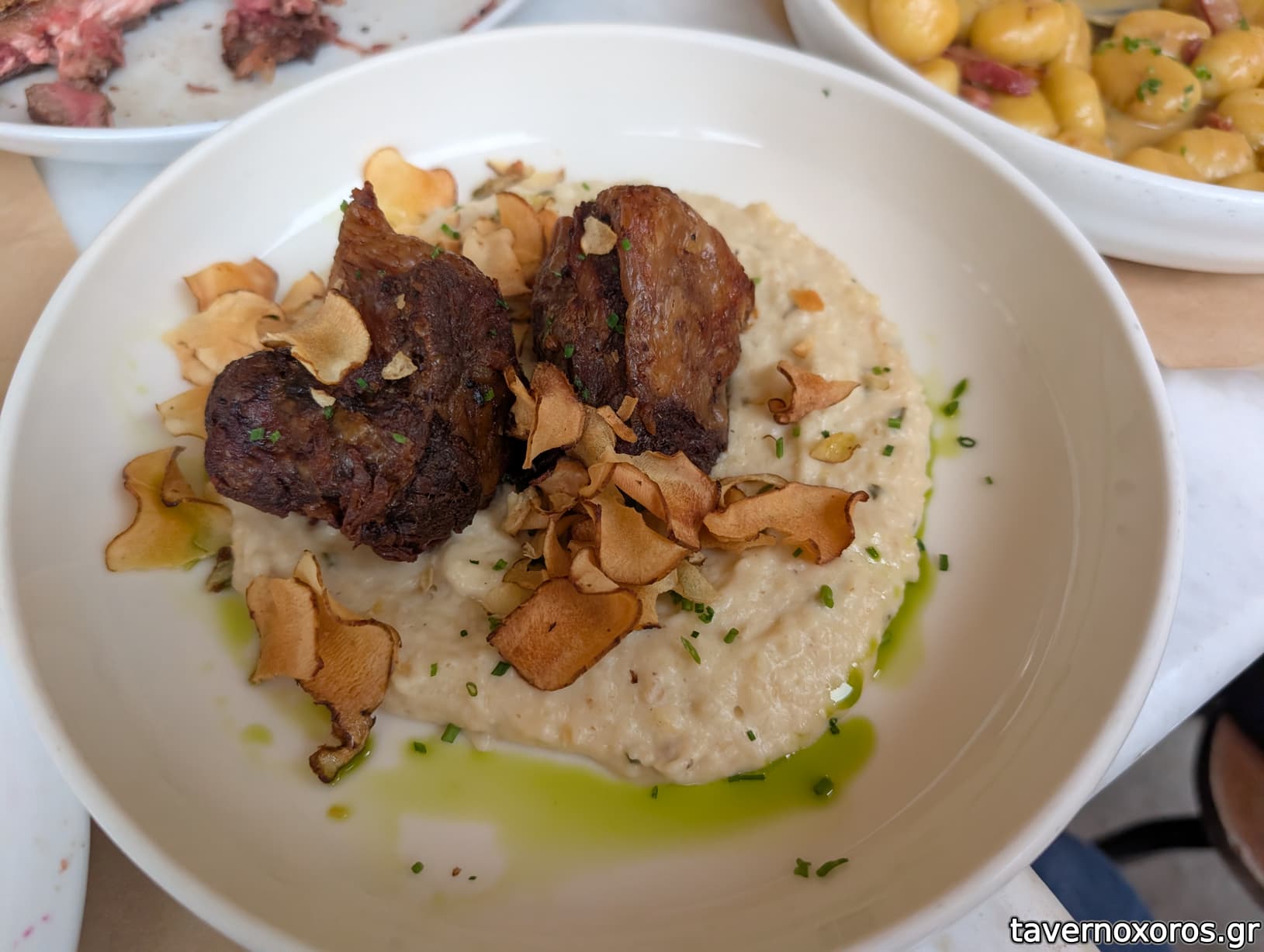 "Σπαλομπριζόλα μόσχου με χαρουπόμελο, λάδι τρούφας και μουστάρδα μούστου" (καλή)
