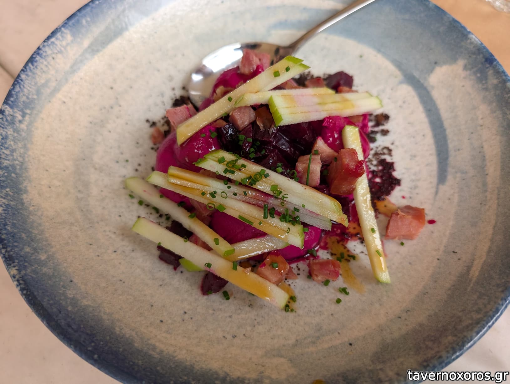 "Τσιζκέικ παντζαριού με χώμα χαρουπιού, σύγκλινο, πράσινο μήλο και καραμελωμένο βαλσάμικο" (καλό)