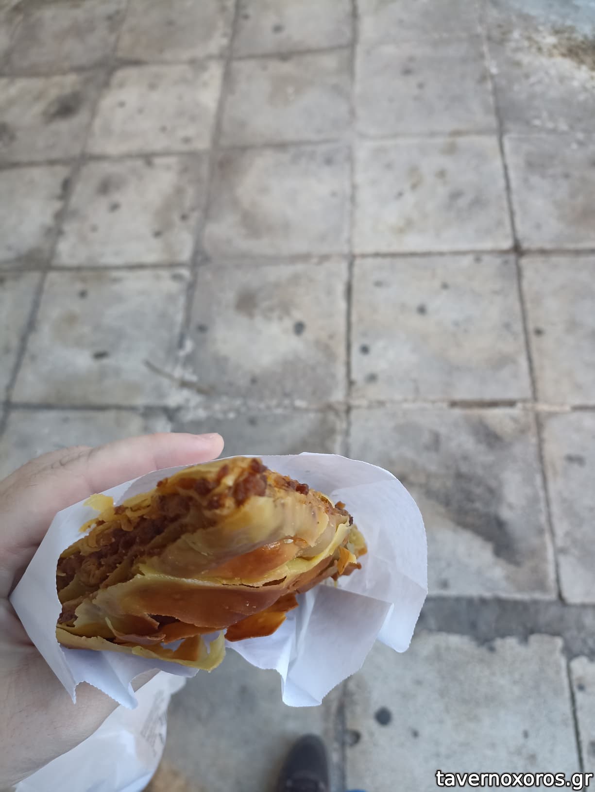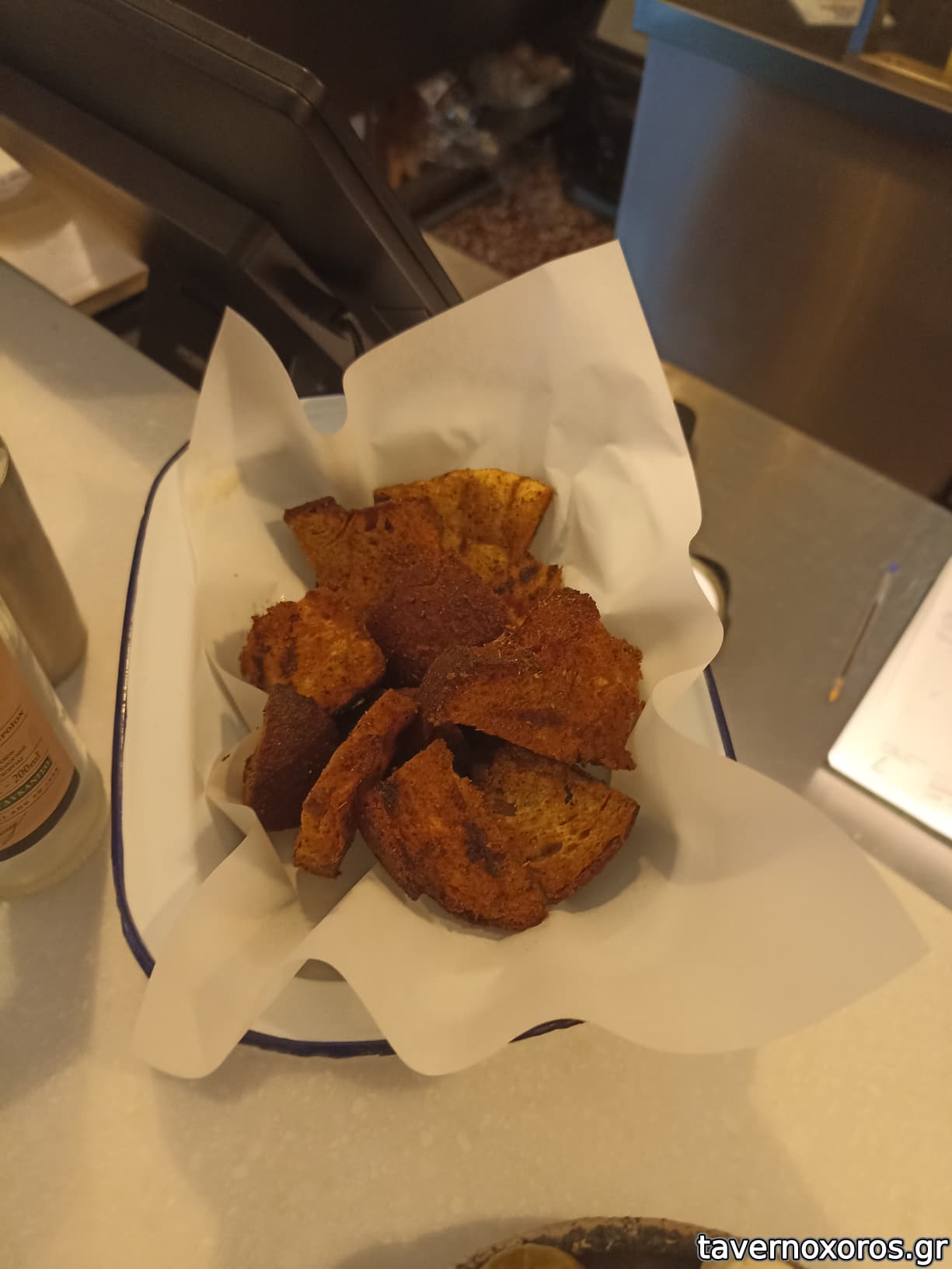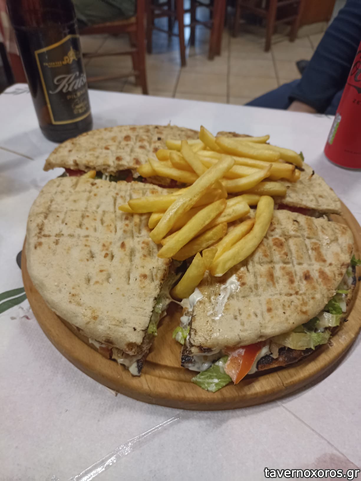 Η πίτα κάπως ιδιαίτερη (τηγανίζεται, ενώ είναι και κατακόκκινη λόγω της γλυκιάς πάπρικας), που το κάνει να ξεχωρίζει. Στα 5€ (αλοιφή extra 0,