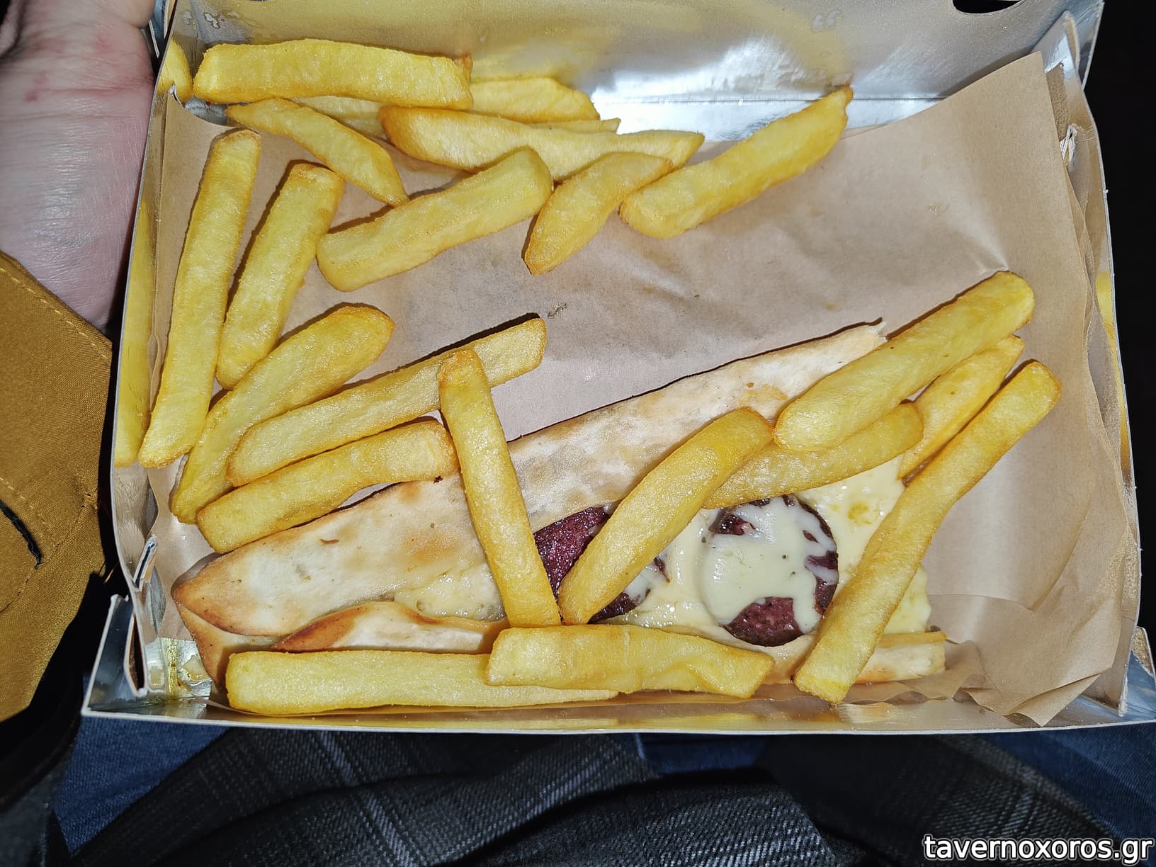 Το burger πατημένο και μικρούτσικο. Ψωμάκι τύπου μπριός, καλό. 2 μπιφτέκια smashed, τα οποία όμως διαλύονταν. Το κέτσαπ δεν το βρήκα ποτέ, την μουστάρδα δεν την κατάλαβα.