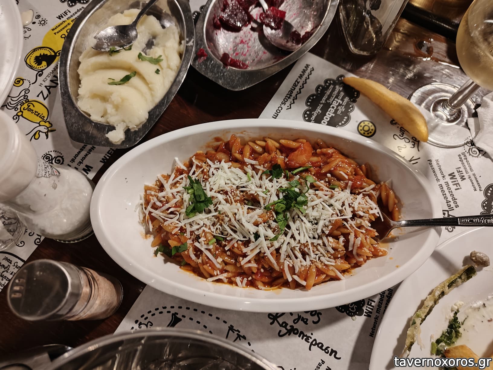 4 50άρια τσίπουρα + 2 μπύρες άνευ, 4 πιατάκια μεζέ και 2 πιάτα, σύνολο 62 ευρώ.