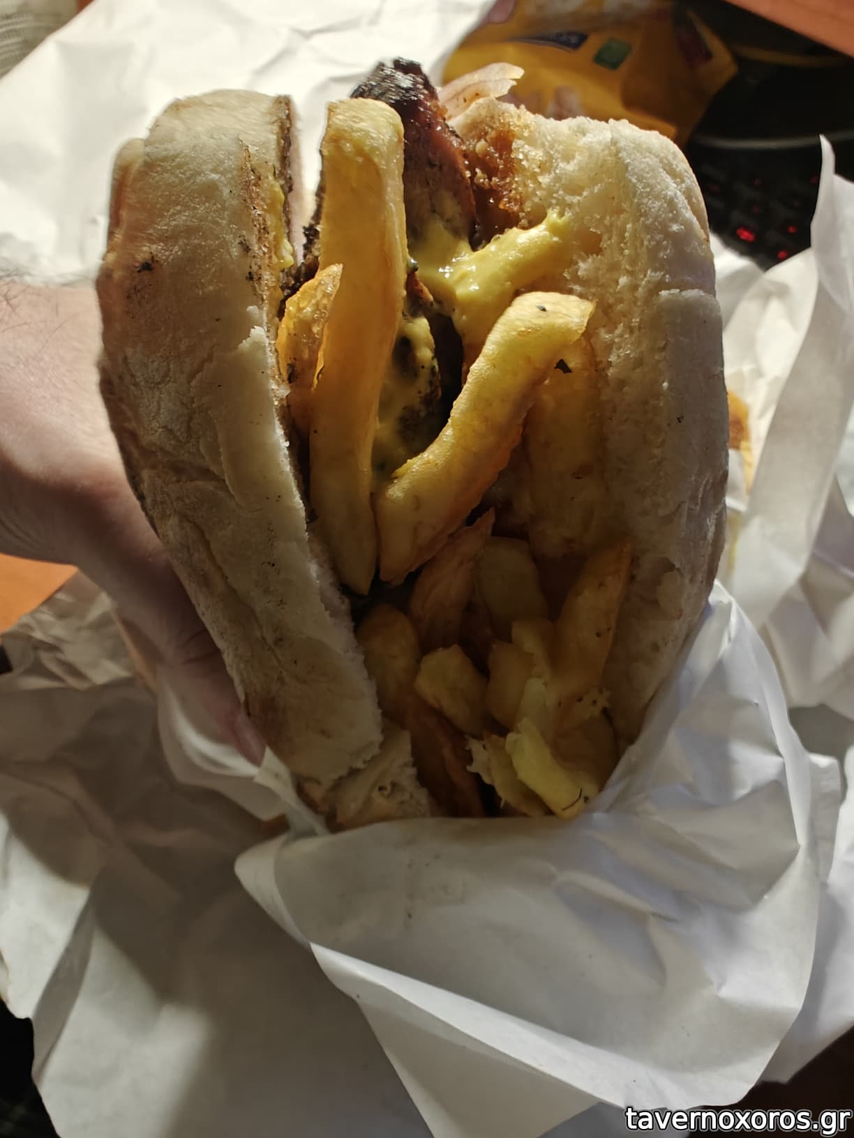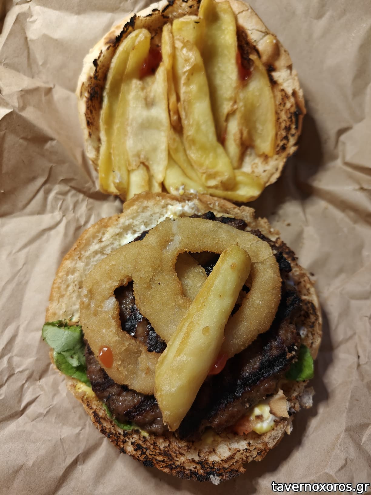Ψωμάκι τίποτα ιδιαίτερο, οι σάλτσες απειροελάχιστες, τα onion rings OK και οι πατάτες (οι τυπικές προκάτ που μαστίζουν πλέον την πόλη) δεν είχαν κανέναν λόγο να είναι μέσα στο burger.