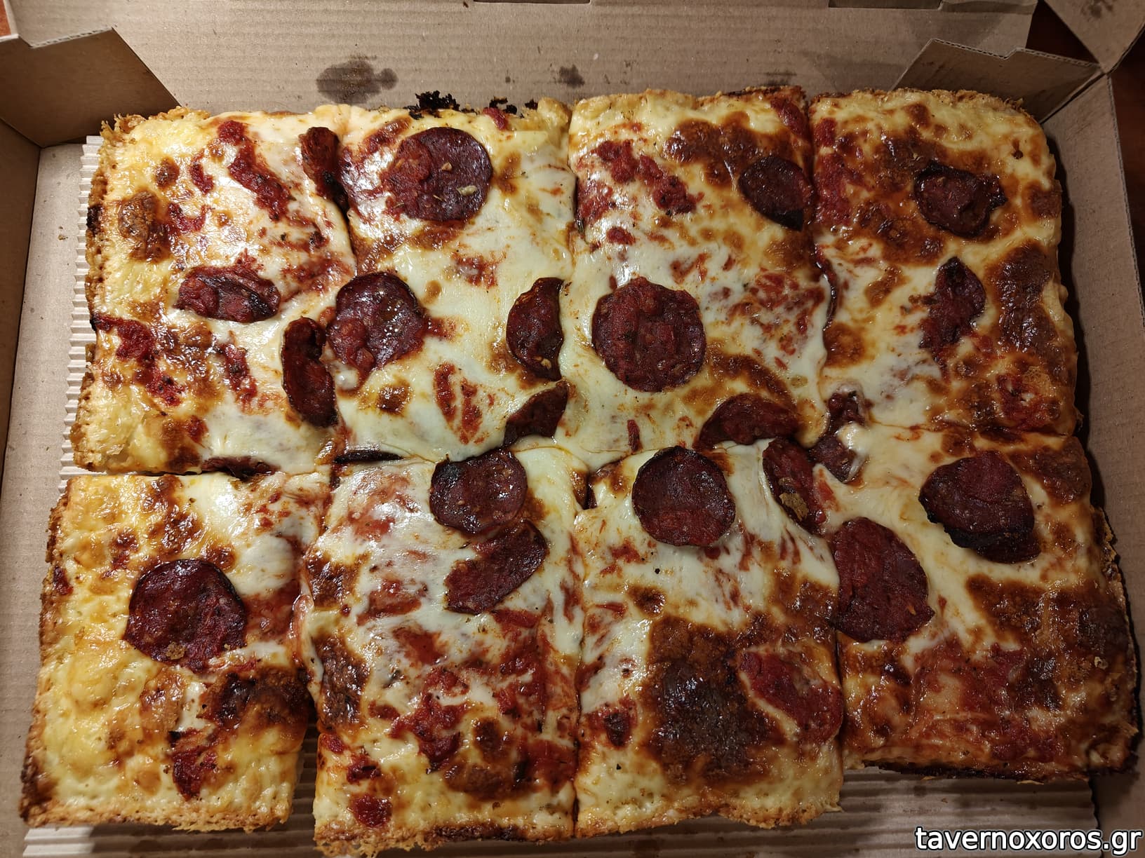 Η πίτσα είναι όντως μεγάλη σε μέγεθος και το ζυμάρι πάρα πολύ χοντρό. Σαν αφράτο ψωμί ένα πράγμα. Είναι γενικά πληθωρική (όπως υποθέτω πως πρέπει να είναι μια τέτοιου στυλ πίτσα), τα υλικά δεν τα λυπούνται. Πολύ σάλτσα ντομάτας, πολύ μοτσαρέλα και μπόλικο σουτζούκι. Όλα τα υλικά νόστιμα, το ζυμάρι αφράτο, η μοτσαρέλα καψαλισμένη στις άκρες, το αποτέλεσμα ήταν πεντανόστιμο και χορταστικότατο. Παρεμπιπτόντως, στην δικιά μου μάλλον ξεχάσανε τον βασιλικό αλλά δεν στεναχωρέθηκα και πολύ.