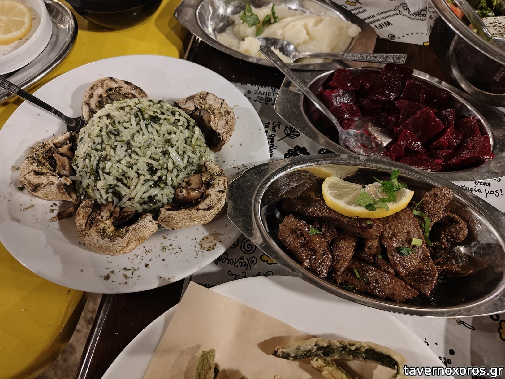 Ντάκο, φάβα, μανιτάρια, τζατζίκι, χτυπητή και πιατέλα κρεατικών.