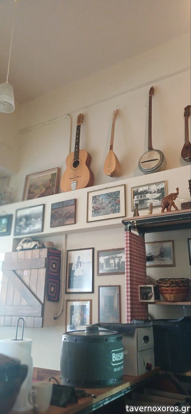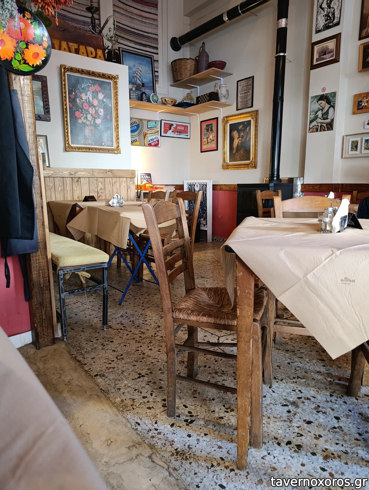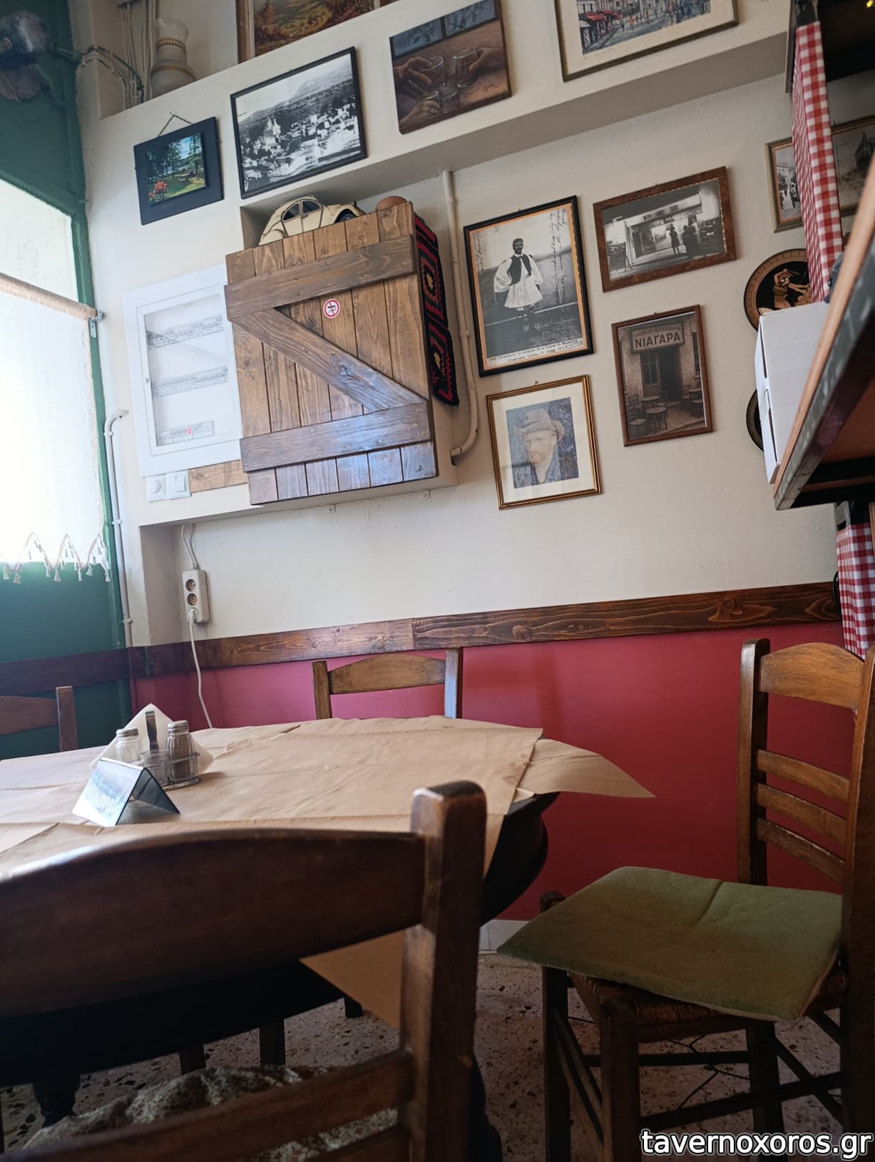 Στα του χώρου, ένα καλαίσθητο, ζεστό μαγαζί με σκούρο ξύλο και πέτρα παντού. Ακόμη και οι τουαλέτες είναι προσεγμένες στη λεπτομέρεια. Χωρίς όμως να χάνει την ταυτότητα του αυθεντικού χωριάτικου χώρου εστίασης, με τη σόμπα του κ την ιστορία του αποτυπωμένη στα ράφια και τους τοίχους. Στους τοίχους στο υπόγειο που είναι και η τουαλέτα, θα δείτε και όλη τη μπουρζουαζία της πολιτικής σκηνής του τόπου, να χαριεντίζεται με τον πολύ συμπαθητικό ιδιοκτήτη που ξεπροβοδιζοντας μας, μας μίλησε πολύ γλυκά και ανθρώπινα.