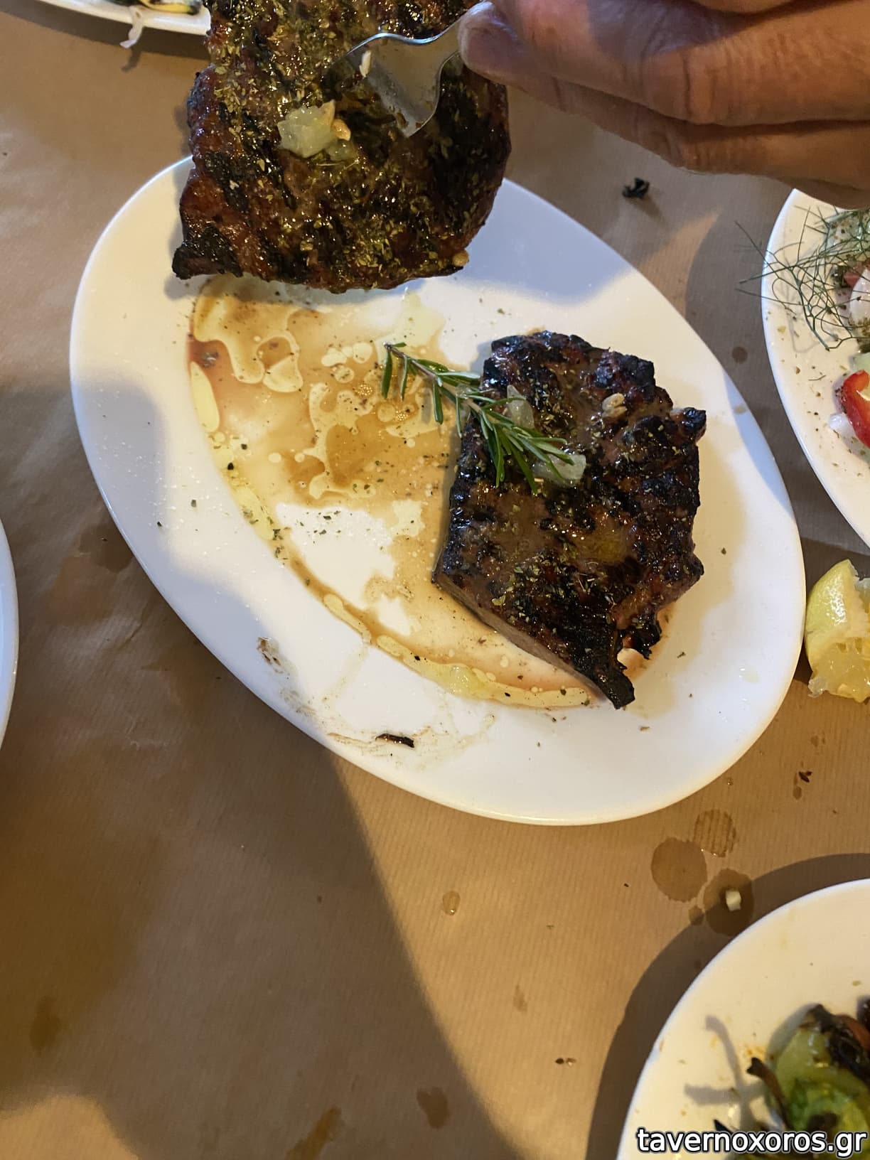 Στα του φαγητού τώρα, πήραμε - ελλείψει γαλοτυρέως - τζατζίκι αρκετά καλό, μια πλούσια χωριάτικη σαλάτα, πατάτες χέρι εννοείται, παϊδάκια αρνίσια μισό κιλό και μια μερίδα πανσετες χοιρινές. Σοκαρίστικα που το χοιρινό είχε τόση γεύση:)) , έχω συνηθίσει το χοιρινό χωρίς γεύση γιατί μου το χαλάνε τώρα δεν ξέρω! Τα παϊδάκια ήταν και αυτά εξαιρετικά εννοείται αλλά ήταν μαριναρισμενα με την ίδια μαρινάδα που ήταν και οι πανσετες. Ελαφριά μεν, με κόκκινο γλυκό πιπέρι, αλλά προσωπικά τα προτιμώ νέτα. Το εξαιρετικό κρέας χρειάζεται μόνο αλάτι. Φάγαμε όμως πολύ καλά στο σύνολο.