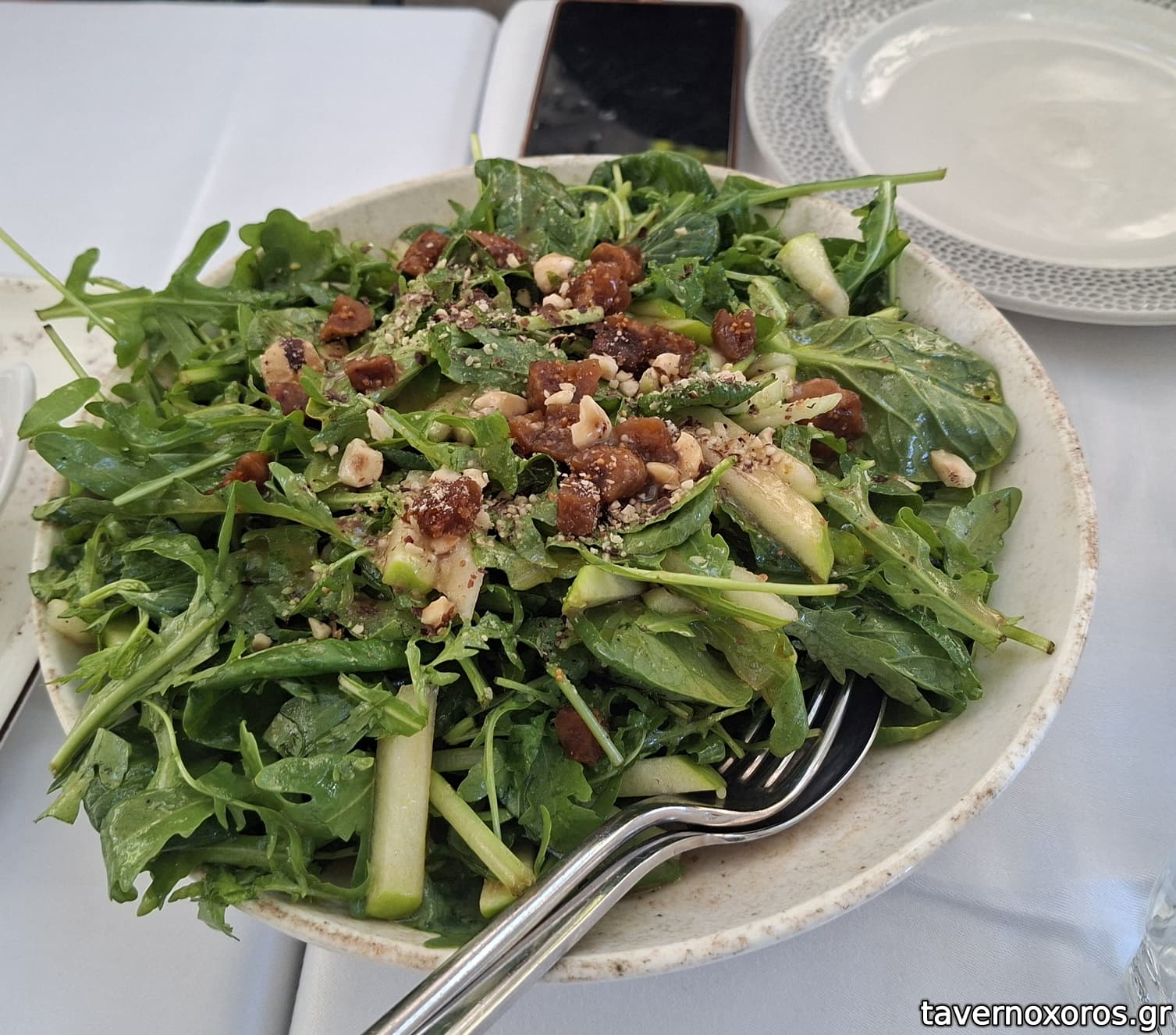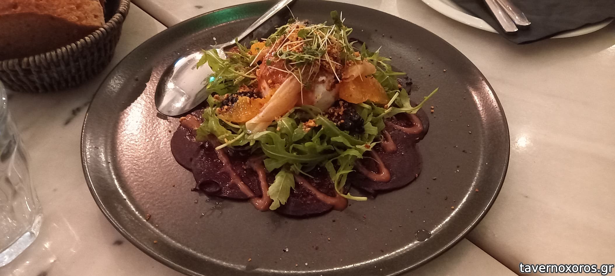 Δοκιμάστηκαν: σαλάτα με καρπάτσιο πατζάρι, ρόκα κτλ (οκ), ρεβίθια με άιβαρ,