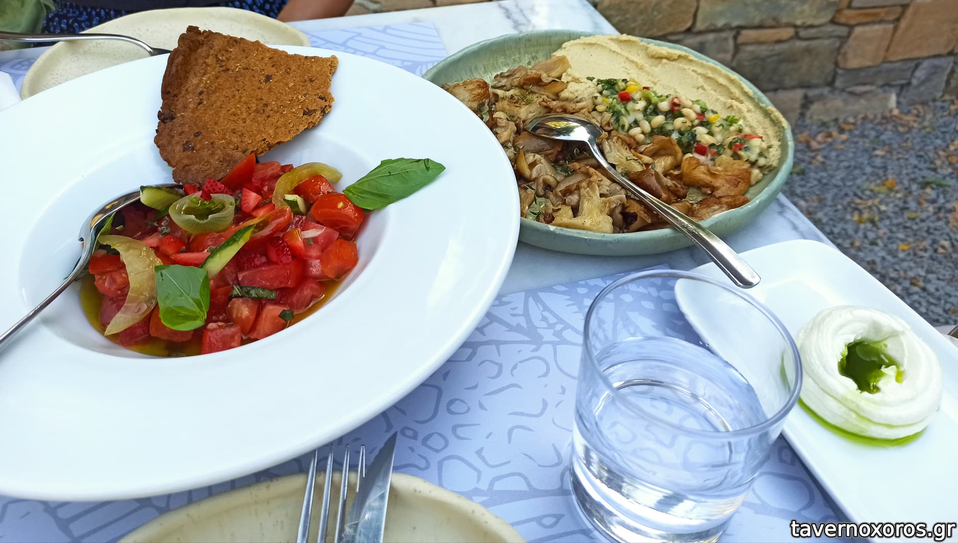 Τομάτα σαλάτα με κράκερ ελιάς και φράουλα + μανιτάρι με χούμους από φασόλια
