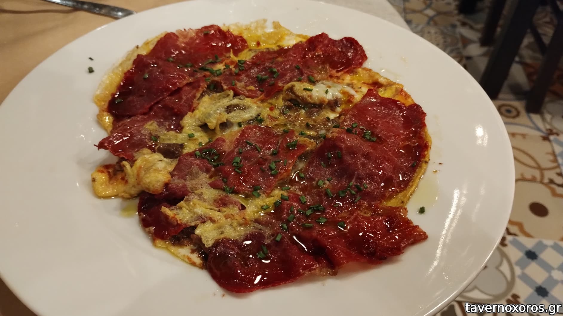 Αβγά (ζητήθηκαν χτυπημένα) και παστουρμάς και καβουρμάς (ωραίο, πλούσιο. Μεγάλη μερίδα)