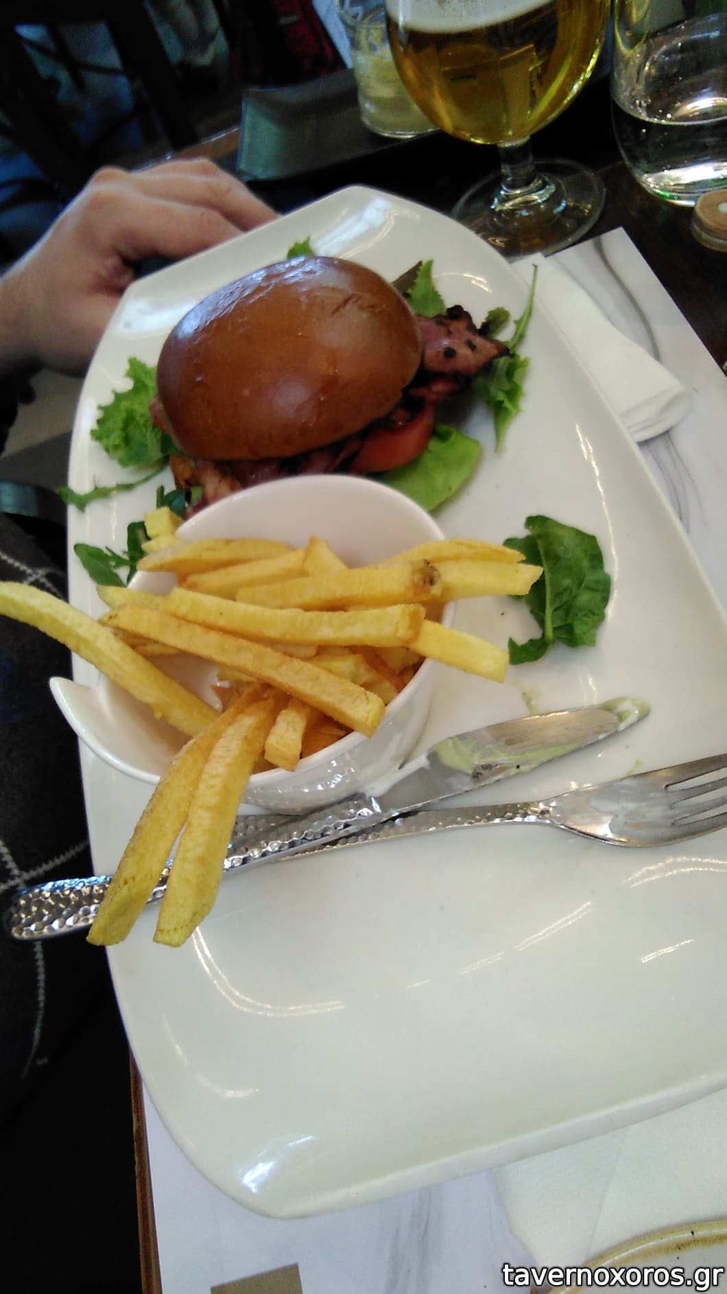 Κοτόπουλο Americain burger (στην περιγραφή στον κατάλογο περιελάμβανε και sauce hollandaise, μάλλον όμως την ξέχασαν ή την έκρυψαν πολύ καλά, γιατί το σύνολο ήταν στεγνό. Φρέσκιες και οκ οι πατατούλες)