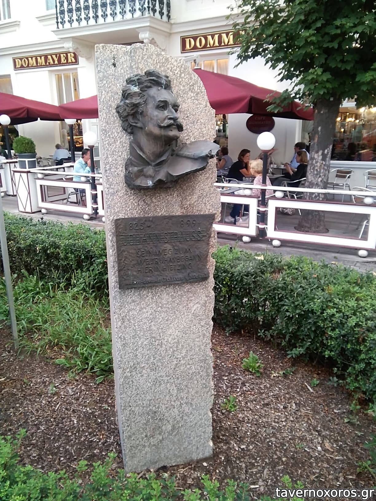 Προτομή του Βασιλιά του Βαλς, Γιόχαν Στράους του Νεότερου, μπροστά από το καφέ