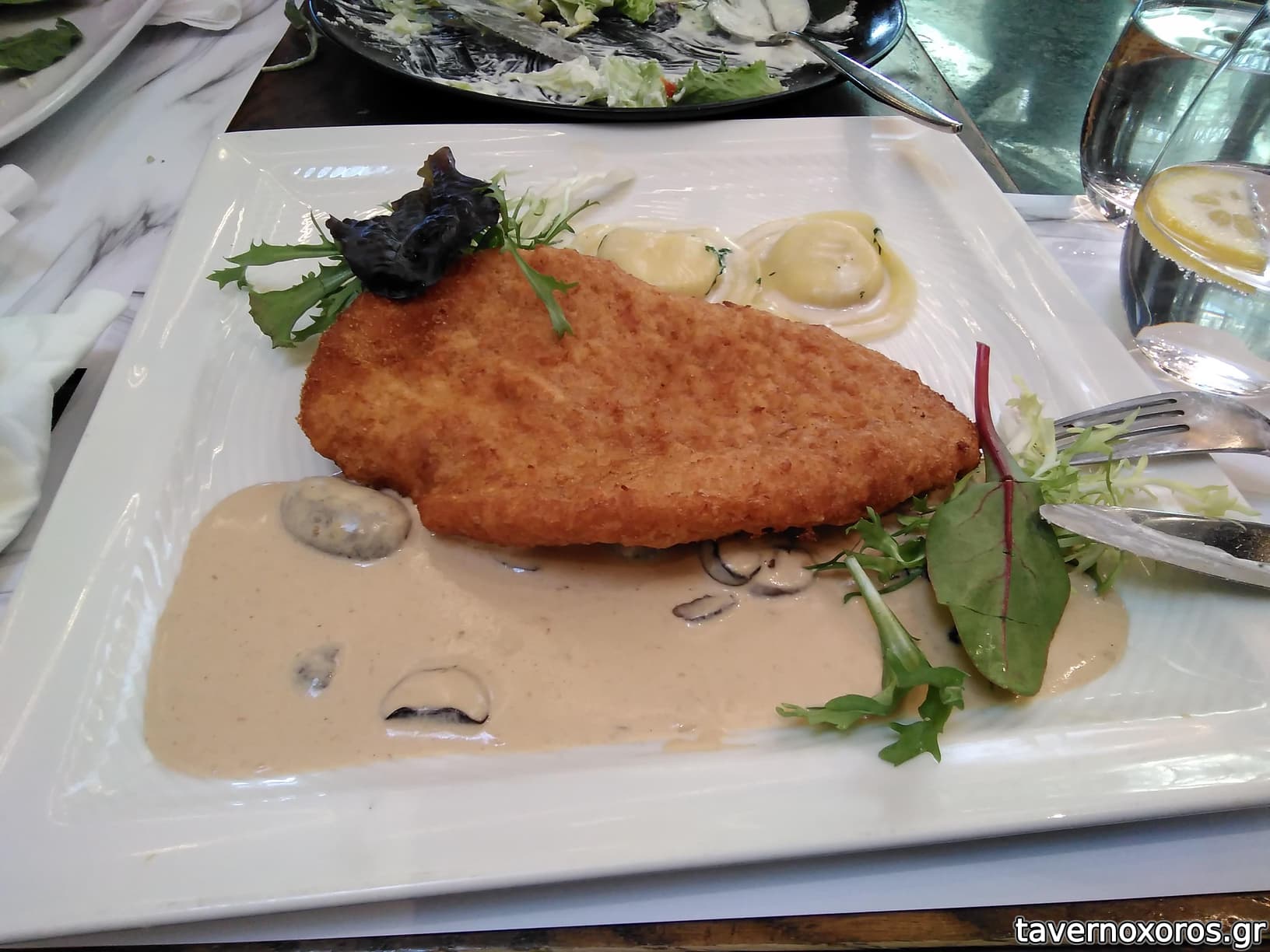 Σνίτσελ κοτόπουλο a la creme (αξιοπρεπές το κρέας, η σως έτσι κι έτσι, τα συνοδευτικά capelleti συμπαθητικά)
