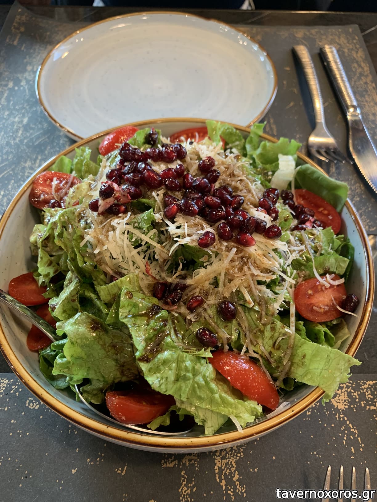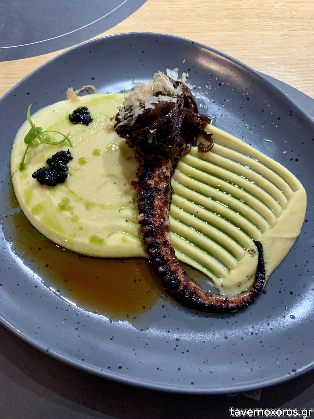Γεύμα αρχές Οκτώβρη, δοκιμάσαμε, φέτα μαριναρισμένη σε κύβους με ωραίο ζυμωτό ψωμί (μικρό πιάτο σαν καλωσόρισμα), σαλάτα με ψίχα μπλε καβουριού (ok), σκορδομακαρονάδα (νόστιμη) και χταπόδι με φάβα (πολύ καλό), μαζί με 2 σετ γευσιγνωσίας 5 κρασιών = € 121,