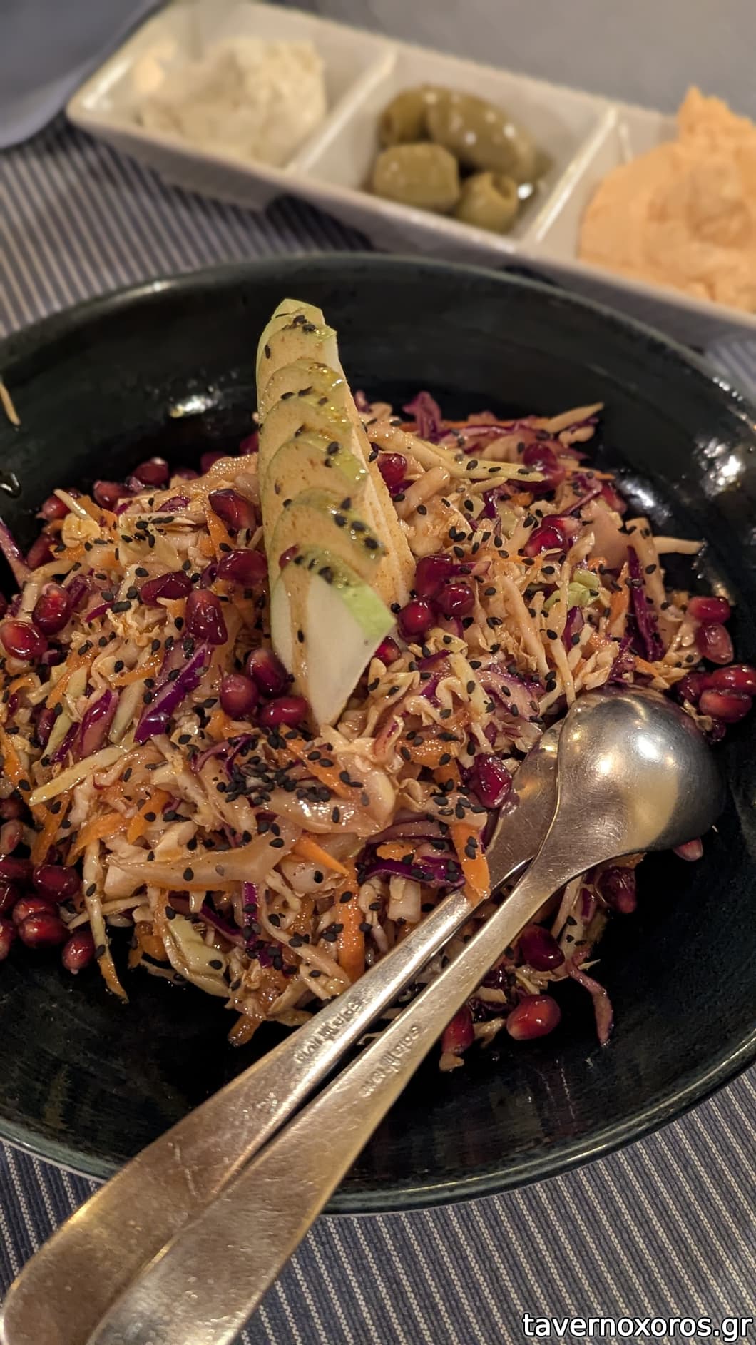 Σαλάτα πικάντικη με επιπλέον του λάχανου-καρότου, πράσινο μήλο, ρόδι, μαυροσούσαμο (πολύ καλή, δροσερή)