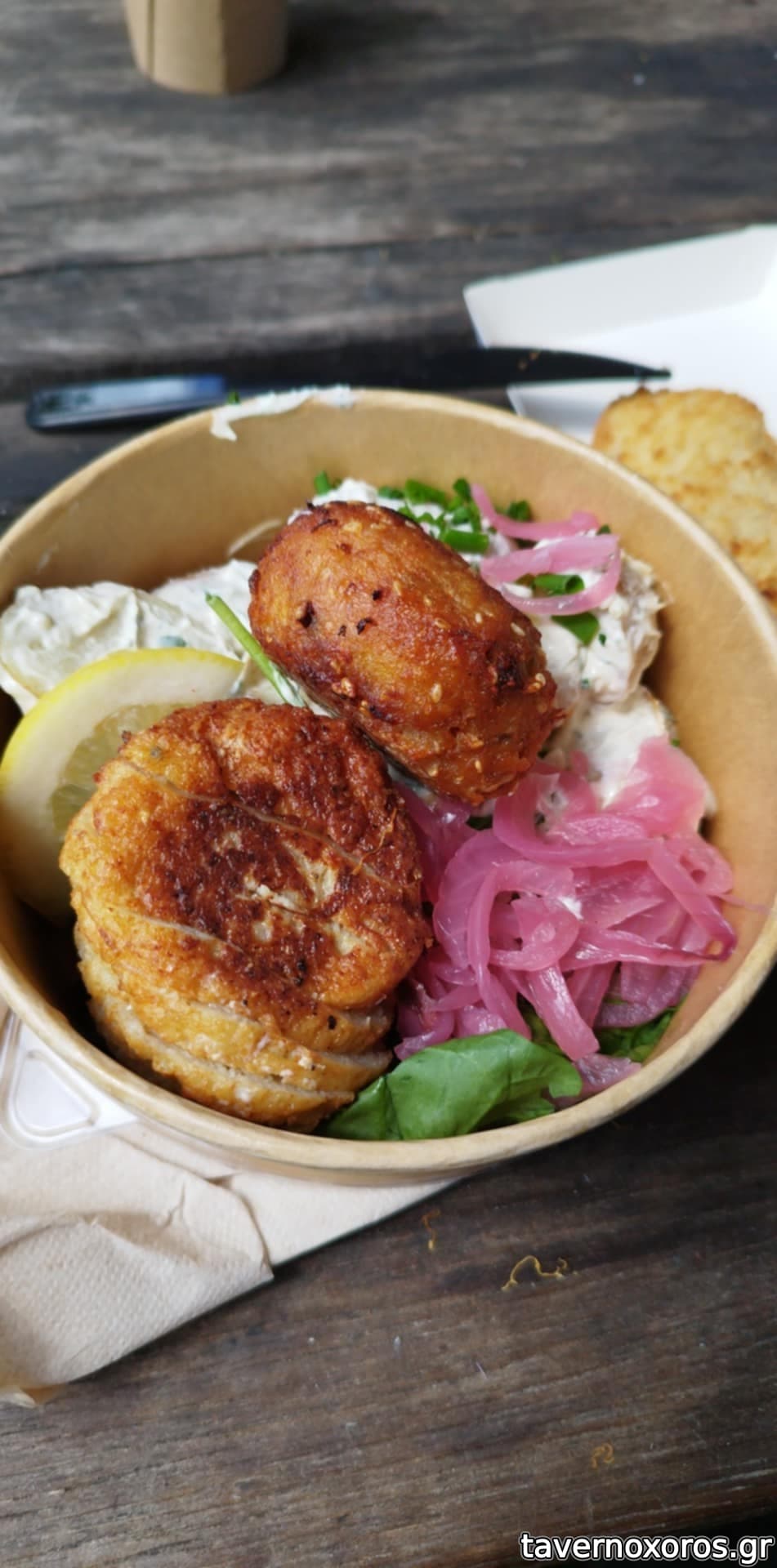 Bowl με ψαροκεφτέδες, πατατοσαλάτα και τουρσί κρεμμύδι (ενδιαφέρον)