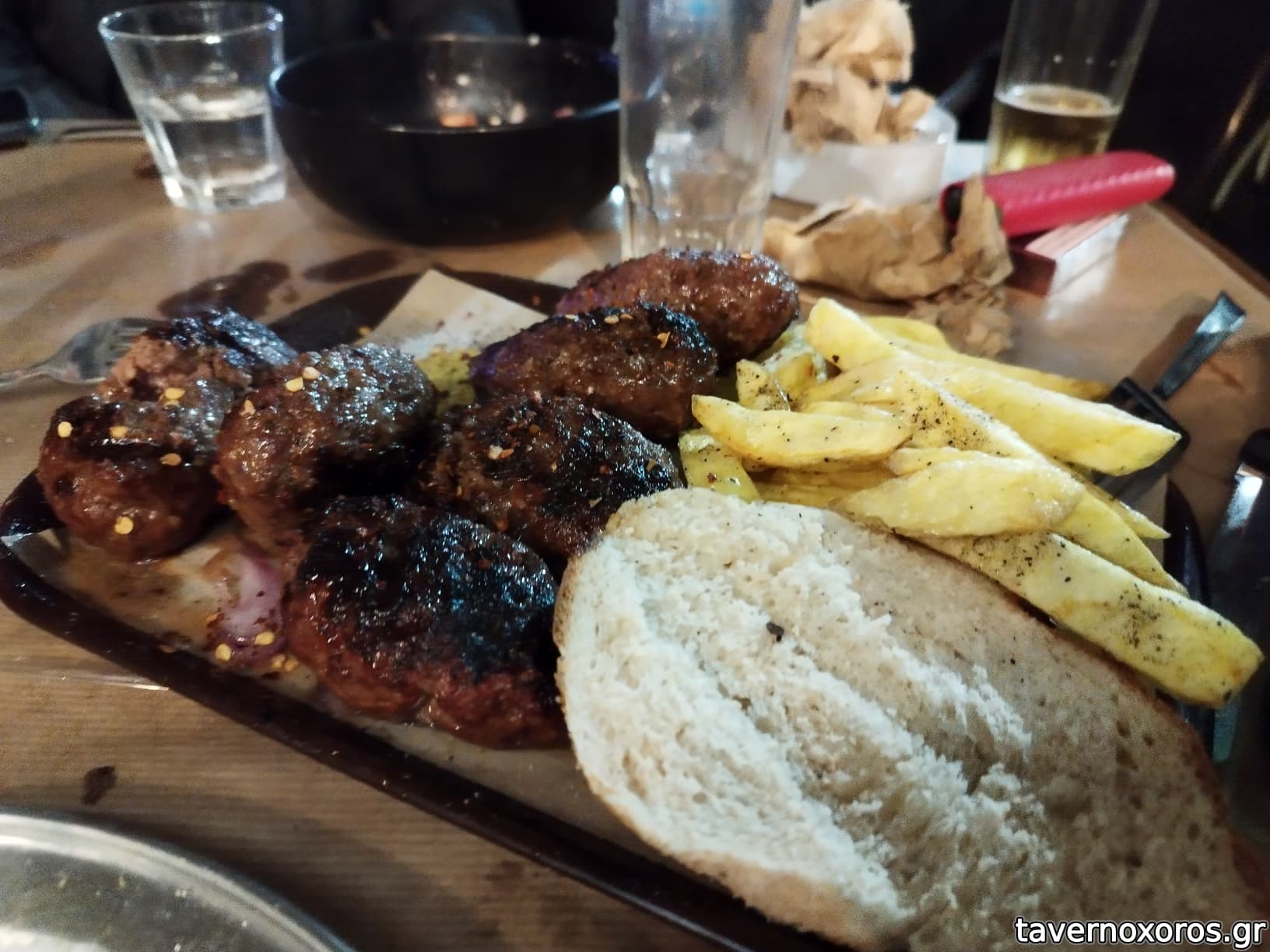 Στα του φαγητού πρόκειται για κλασική ταβέρνα επηρεασμένη από άλλα χωριά του νομού. Δηλαδή σουβλάκι-μπιφτεκάκι μου φάνηκαν κοψιά Χαλκηδόνας, νόστιμα και τα 2, μπαμπάτσικα και καλοψημένα. Μπιφτέκι βουτύρου, λαστιχωτό, έβγαζε ίδια μπαχαρικά με αυτό του Αρχοντικό στο Άδενδρο, υστερώντας βέβαια σε ποιότητα και γεύση, μια χαρά όμως. Παντσετούλες επίσης καλές. Αγγουροντομάτα απλή, με πολύ νόστιμη ντομάτα. Πατάτα τηγανητή χεράτη, πολύ καλή. Με ενημέρωσαν για χειροποίητη τυροκαυτερή δυνατή που δεν ήταν διαθέσιμη.