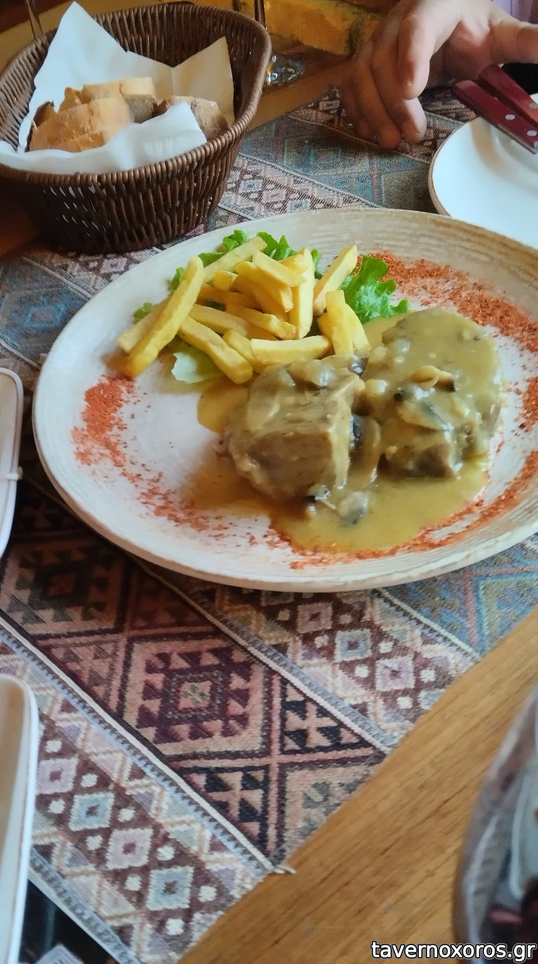 Δοκιμάσαμε χοιρινή πανσέντα με μανιτάρια και κασέρι (καλή) πολύ λεπτή και διπλωμένη στην μέση ώστε να περιέχει την γέμιση.