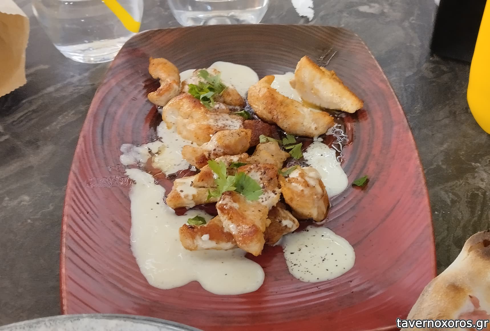 Κοτόπουλο με λευκή σως κάρυ σερβιρισμένη σε πήλινο και με αρκετή σάλτσα αλλά οκ.