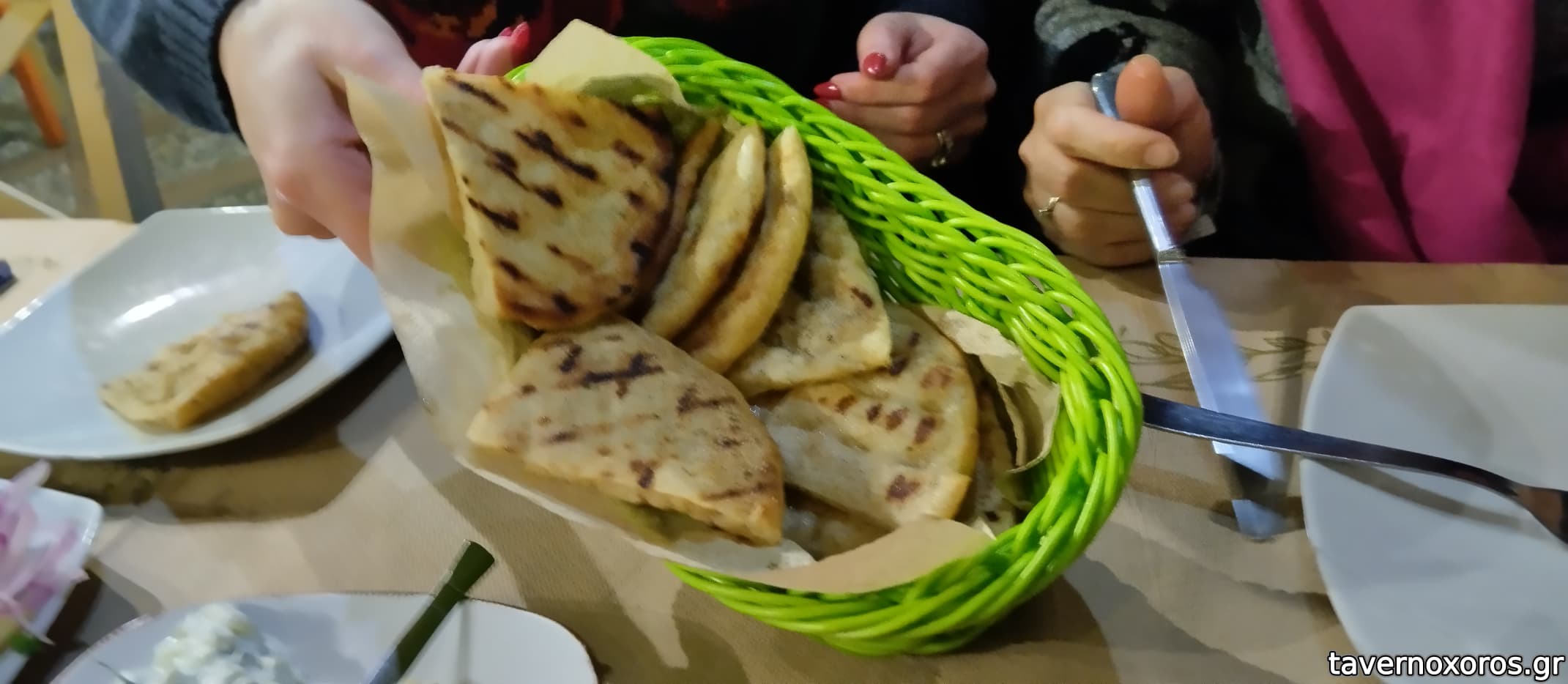 Όλες οι μερίδες της ώρας σερβίρονται σε λαδόκολλα με συνοδεία πατάτας ντομάτας και κρεμμύδια.