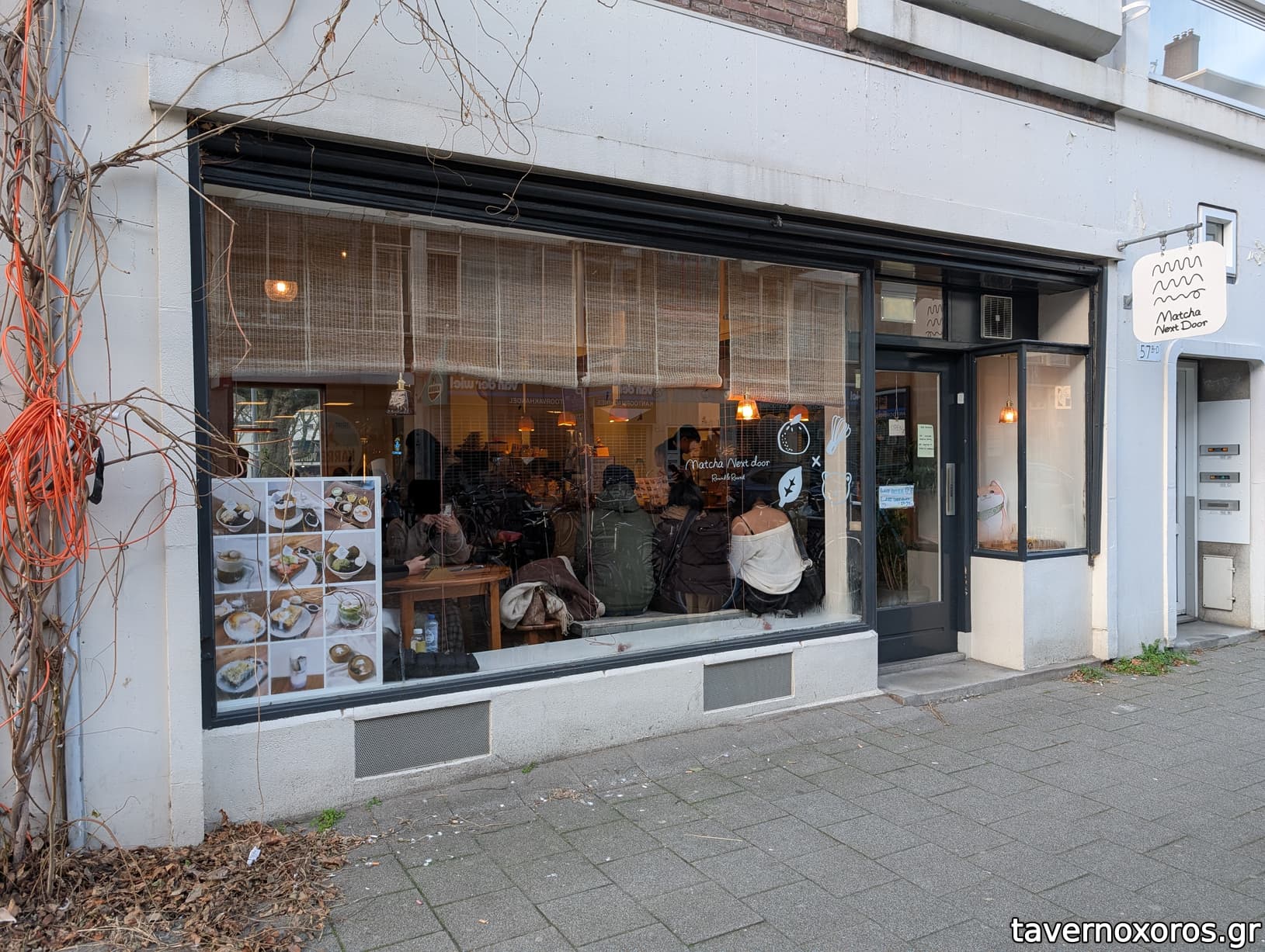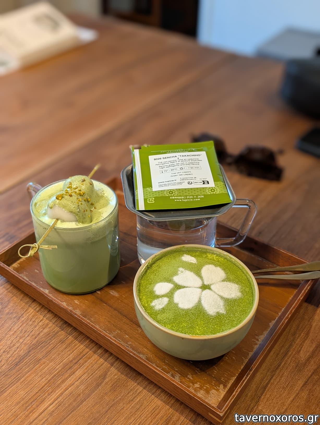 Morning green (αριστερά), matcha tiramisu (δεξιά) και τσάι sencha