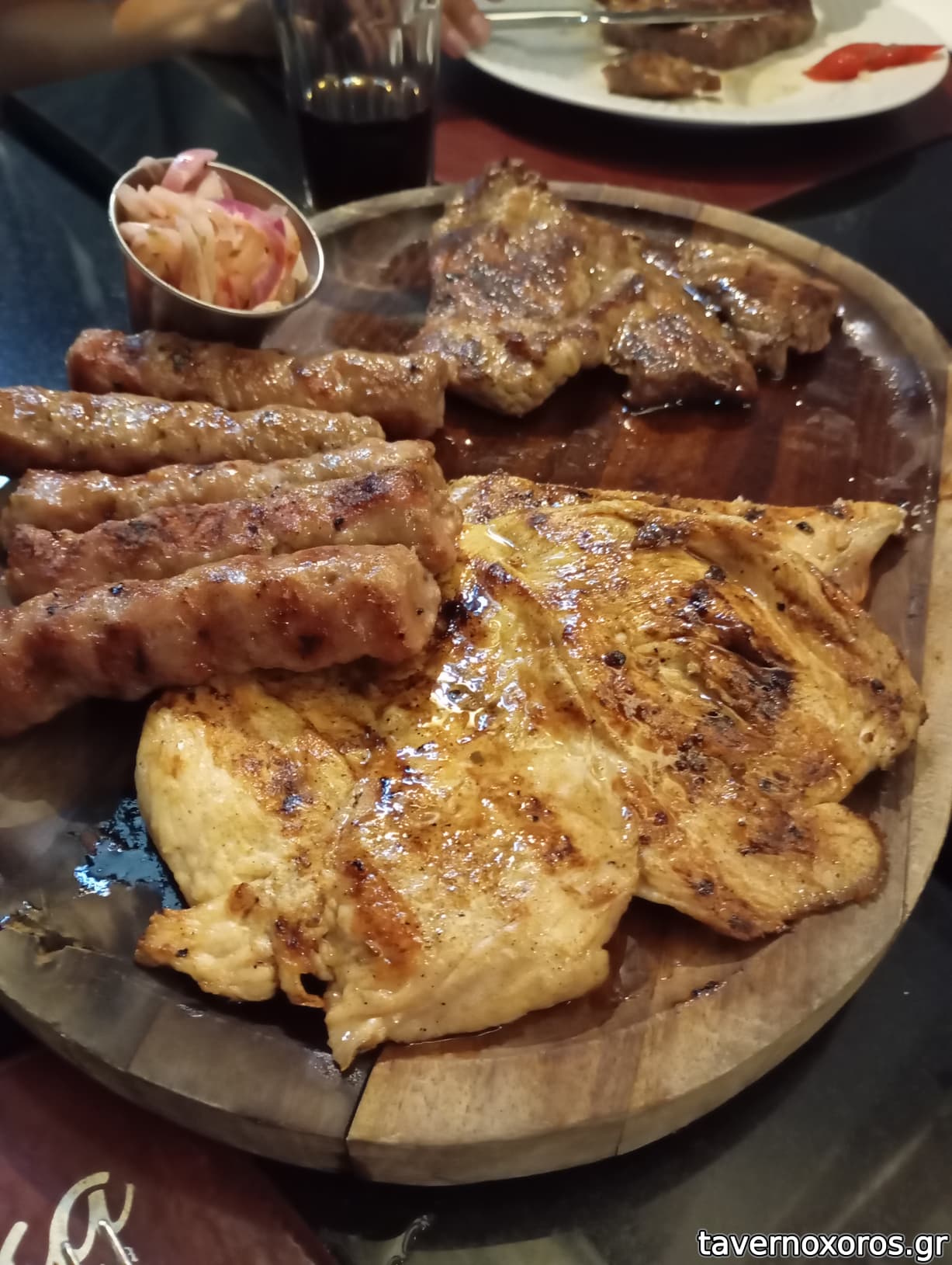 Όλα τα κρεατικά ήρθαν μαζί σε μια ξύλινη πιατέλα, με συνοδευτικό ψιλοκομένο κρεμμύδι με βαλσάμικο. Η ντοματοσαλάτα όπως φωτό, αγαπάνε κρεμμύδι φαίνεται. Νερό, ψωμί ή κάτι άλλο δεν έρχεται αν δεν το παραγγείλεις.