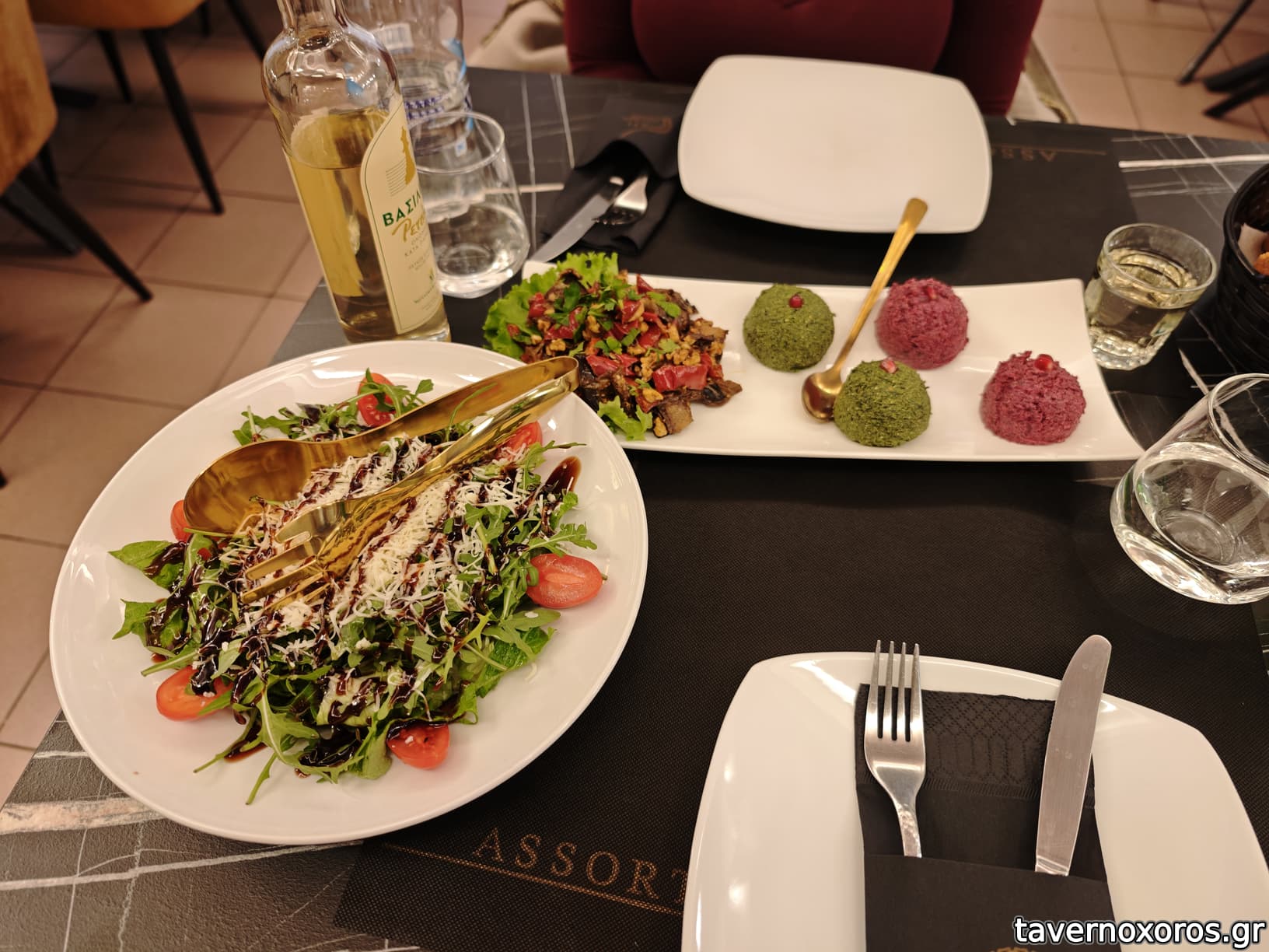 Σαλάτα ρόκα μπροστά και πίσω πκχάλι (μελιτζάνα, πιπεριά, καρύδι στα αριστερά και σπανάκι και παντζάρι στα δεξιά)
