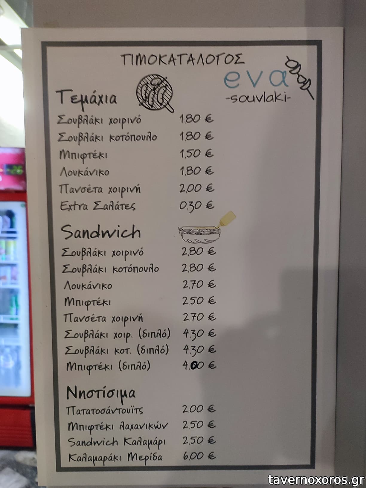 Αν και δεν αναγράφονται τιμές στον κατάλογο, προφορικά μας ενημέρωσαν ότι κάνουν και σάντουιτς. Πήραμε ένα σουβλάκι χοιρινό σε πίτα (2,