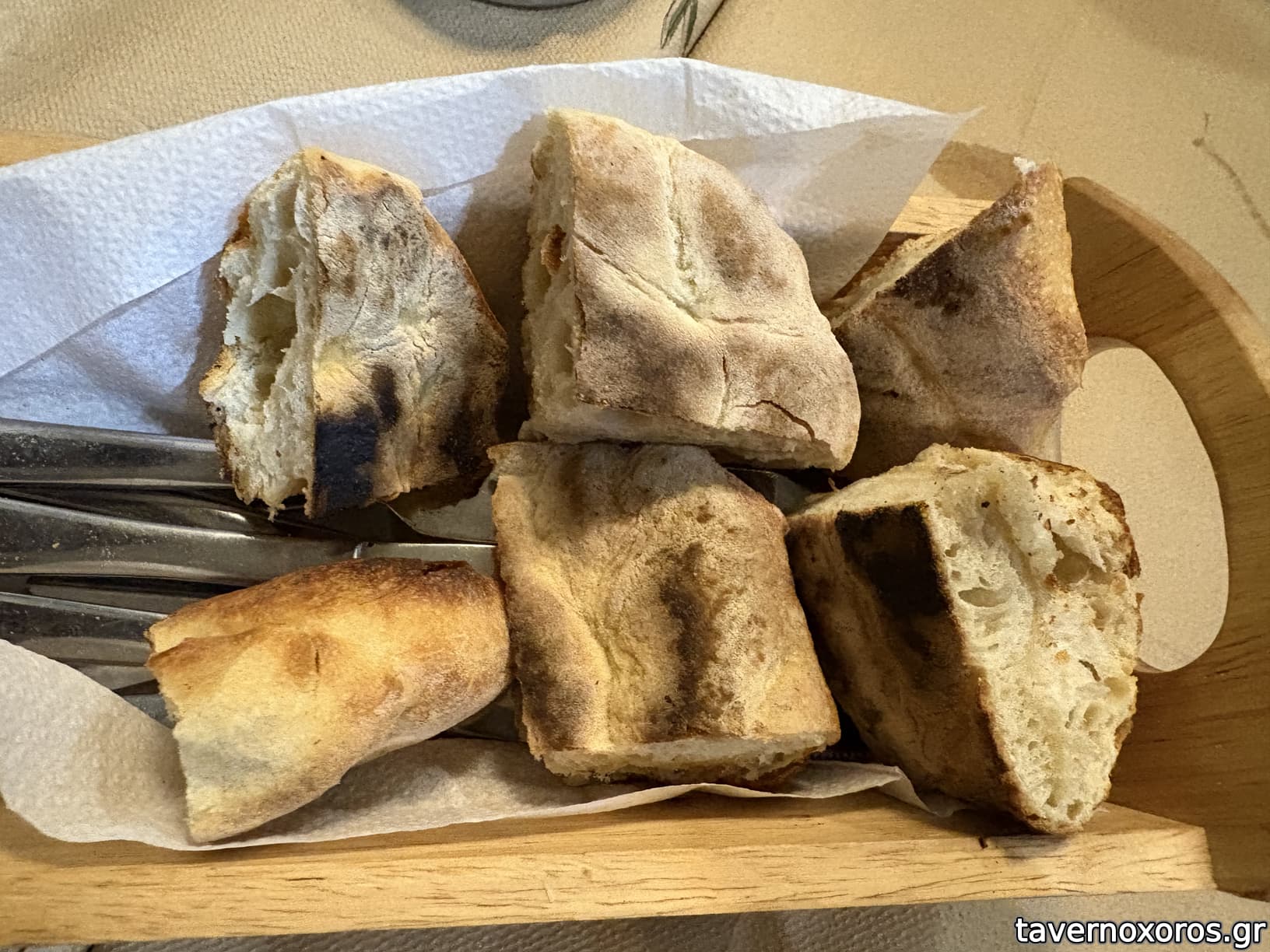 1 καλωσόρισμα με αρσενικό Νάξου σε λάδι από τσίλι, 1 βούτυρο καπνιστό με δέρμα από χοιρινό, ελιές στο ξύλο με 15 μυρωδικά, ψωμί στο ξύλο με λάδι, εξαιρετικό