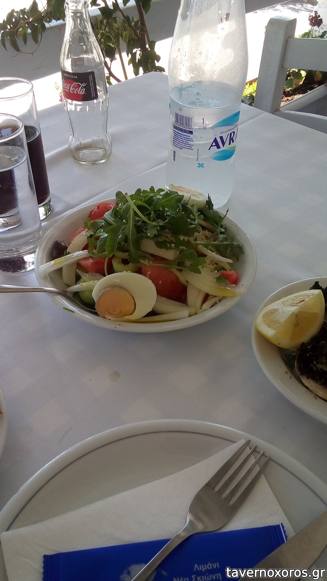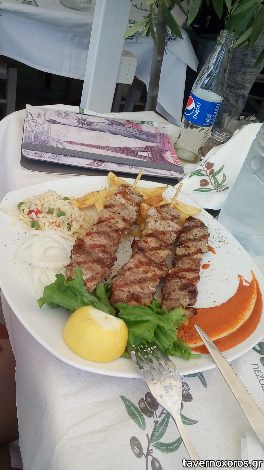 Κουβέρ, 6 σουβλάκια, 4 σουτζουκάκια, χωριάτικη, κολοκυθάκια, 2 κόλες, 1 μεγάλο νερό 20 ευρώ