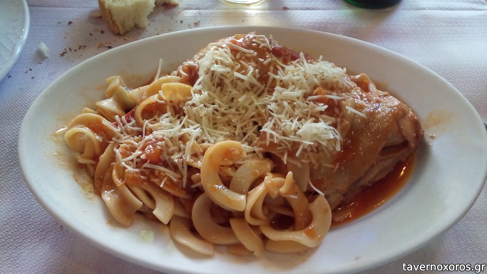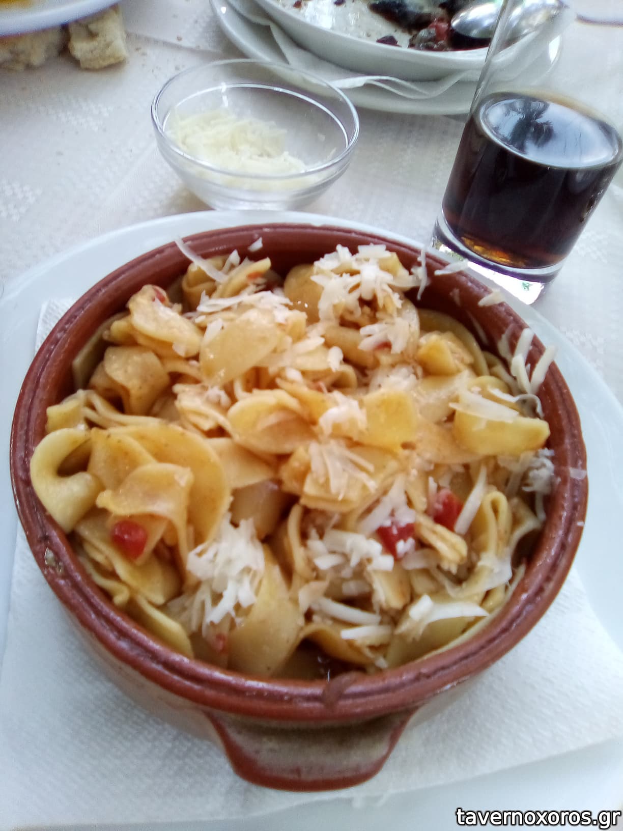 Το χαρτί στο δωμάτιο έγραφε ότι σερβίρονται και ζυμαρικά κι έτσι είπαμε να φάμε μια μακαρονάδα αλλά δυστυχώς είχε μόνο κρεατικά της ώρας, κι έτσι πήραμε 2 σνίτσελ κοτόπουλο άλα κρέμ, πολύ κακό πανάρισμα και παρατηγανισμένο κρίμα γιατί η σάλτσα ήταν πολύ καλή, χωριάτικη και τζατζίκι καλά μαζί με 2 κόκα κόλες 30 ευρώ με απόδειξη.