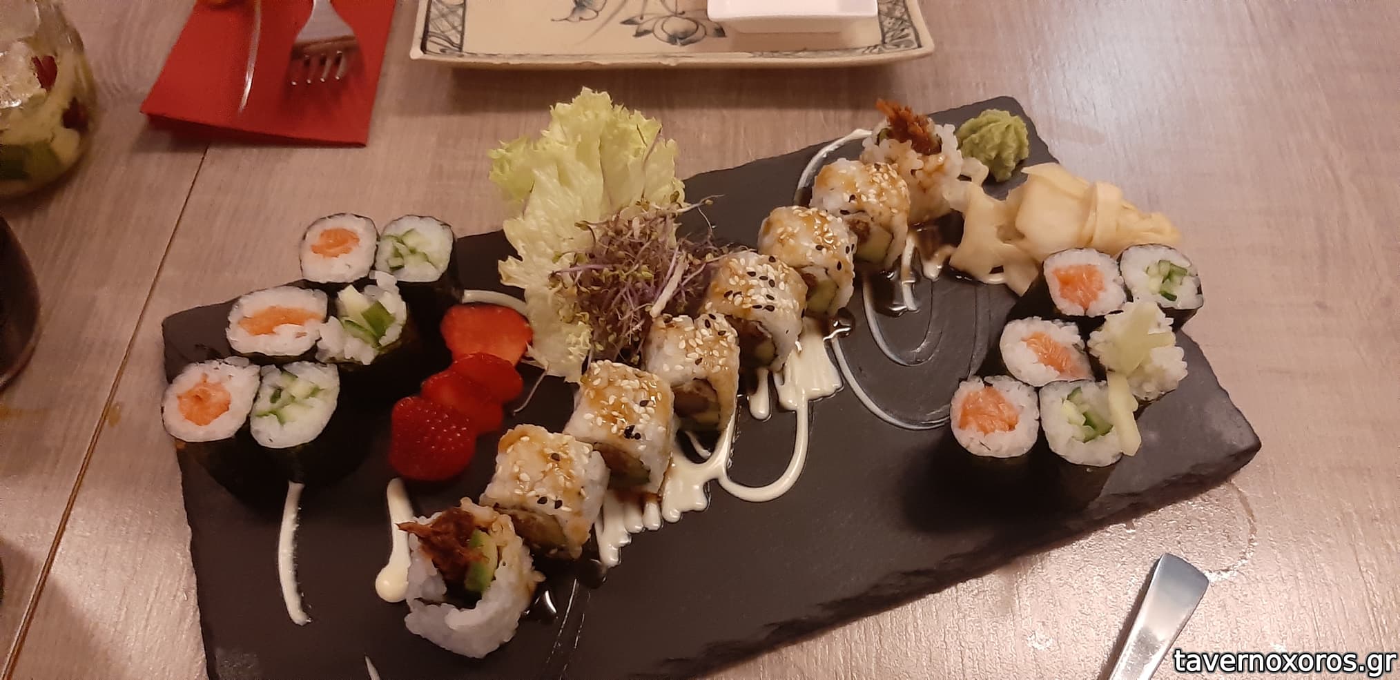 Σούσι απο κατηγορια μενού , 15 ευρώ. Κάποια καλά, κάποια μέτρια, εξαιρετικό γουασαμπι.