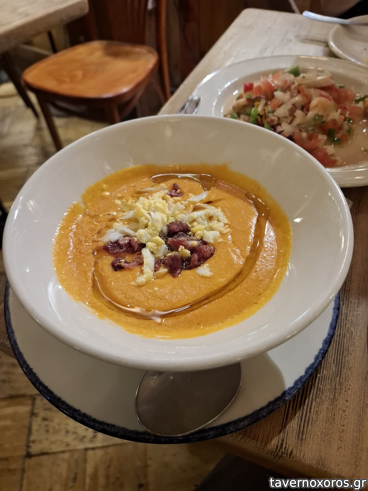 Salmorejo (cold tomato soup with cured ham and boiled egg)