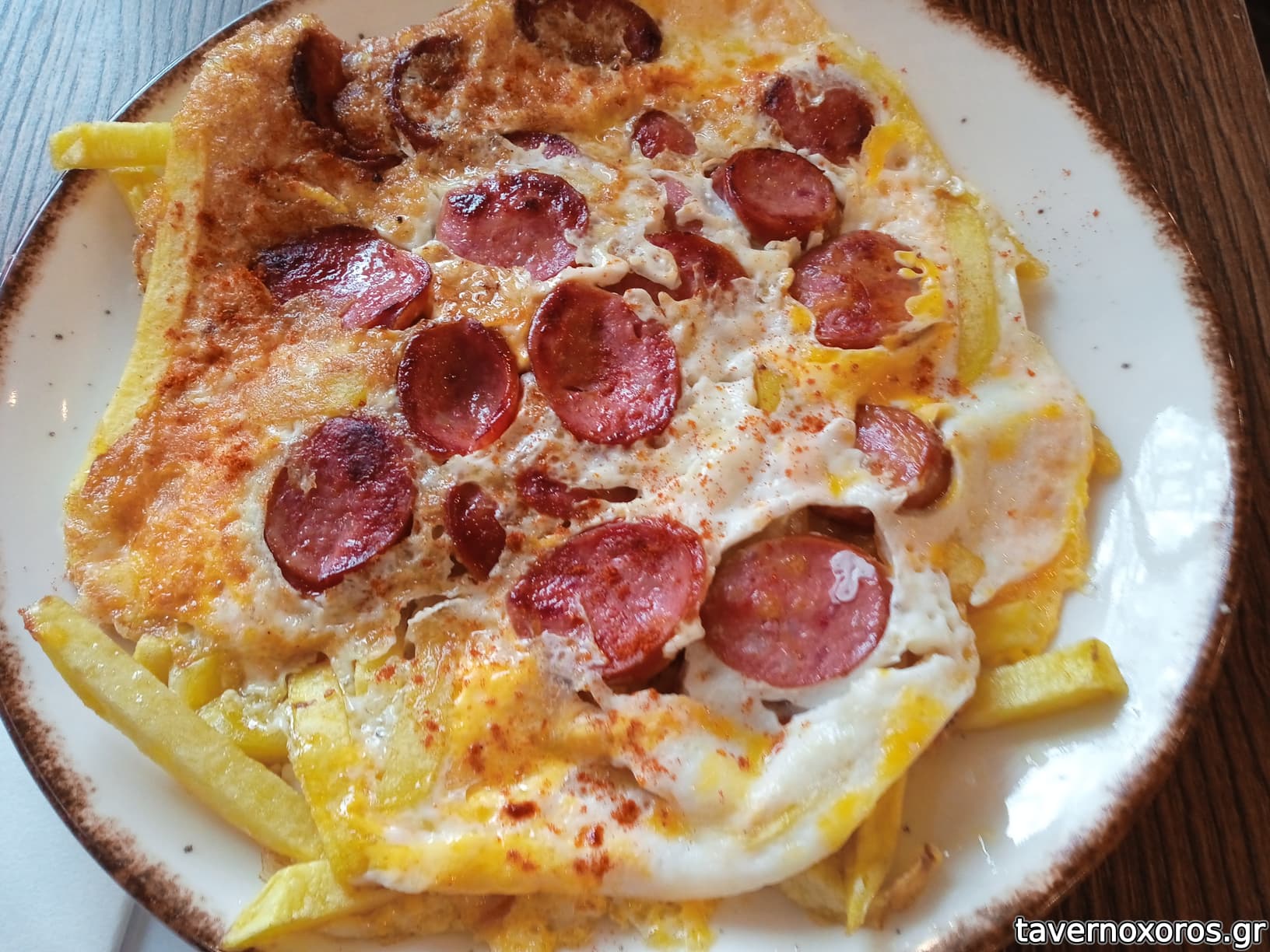 Πατάτες τηγανητές με αβγό και λουκάνικο χωριάτικο