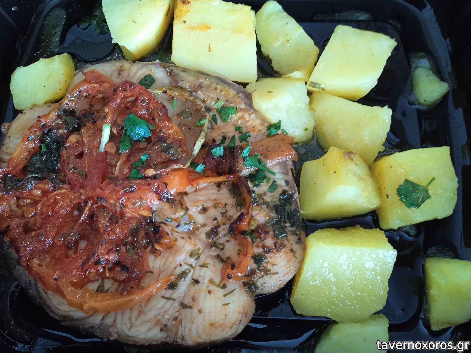 Χοιρινή μπριζόλα με πατάτες φούρνου και ρύζι