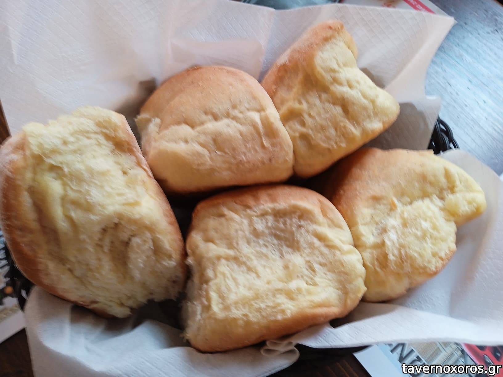 Ψωμί έφεραν άφθονο, 4 μεγάλα πανεράκια, από 6-7 φέτες στο καθένα, αλλά όλο αυτό το ψωμί το χρέωσαν 2 €. Στο τέλος κέρασαν μπόλικα γλυκάκια, 2 πιατέλες με ποικιλία συν 2 μπολάκια παγωτό.