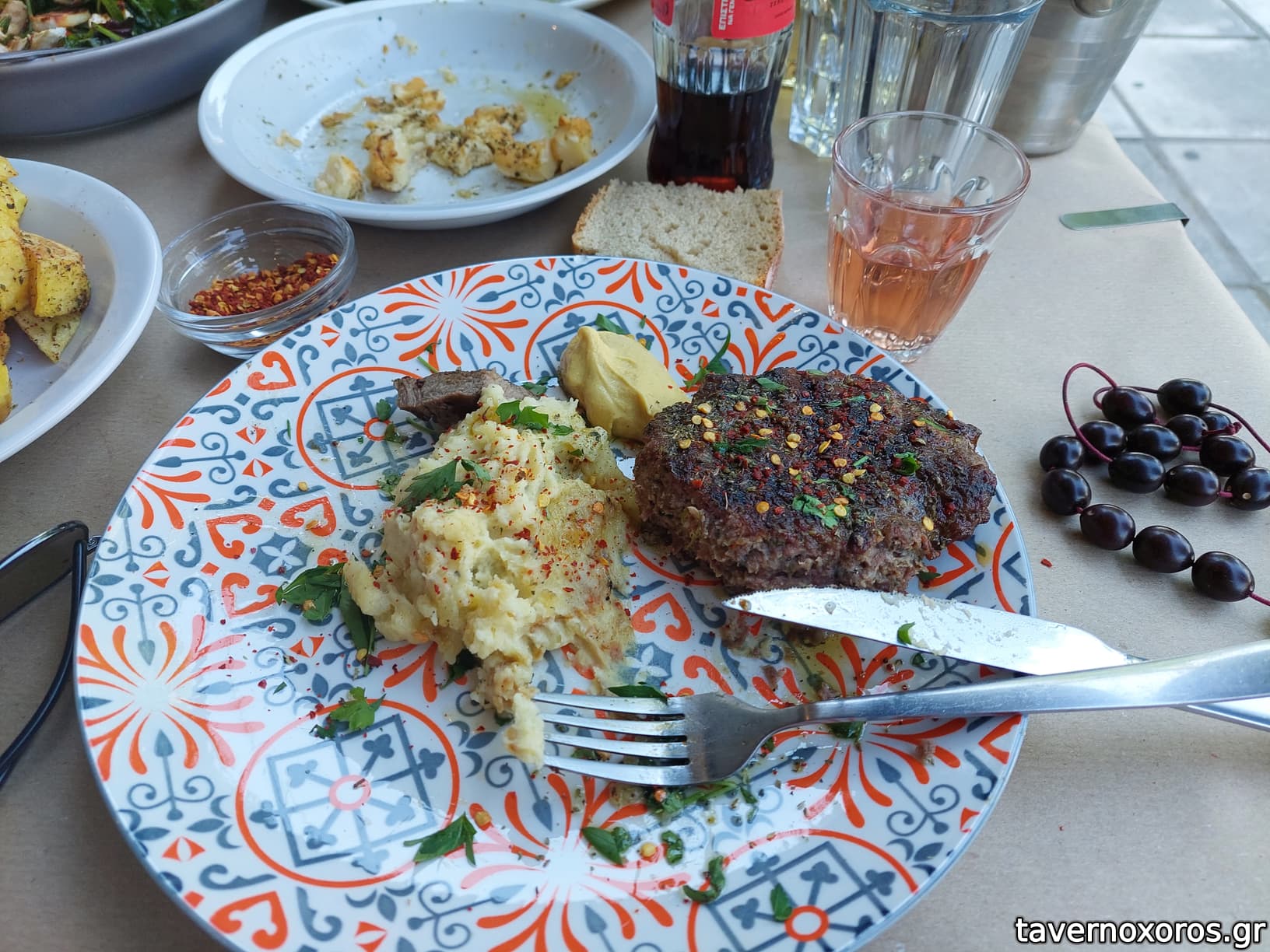 Κυριακή μεσημέρι με κλεισμένο τραπέζι. Πρώτα οι σαλάτες αλοιφές και τα ποτά. Περιμένουμε καμμιά 45 λεπτά και φυσικά καμμιά ενημέρωση από τους υπεύθυνους. Σε ερώτηση αμέσως μετά πήραμε την απάντηση σε 2 λεπτά. Τα κυρίως γεύματα λοιπόν κρεατικά όπως είπα ήρθαν σε διάστημα αναμονής 1 έως 1,