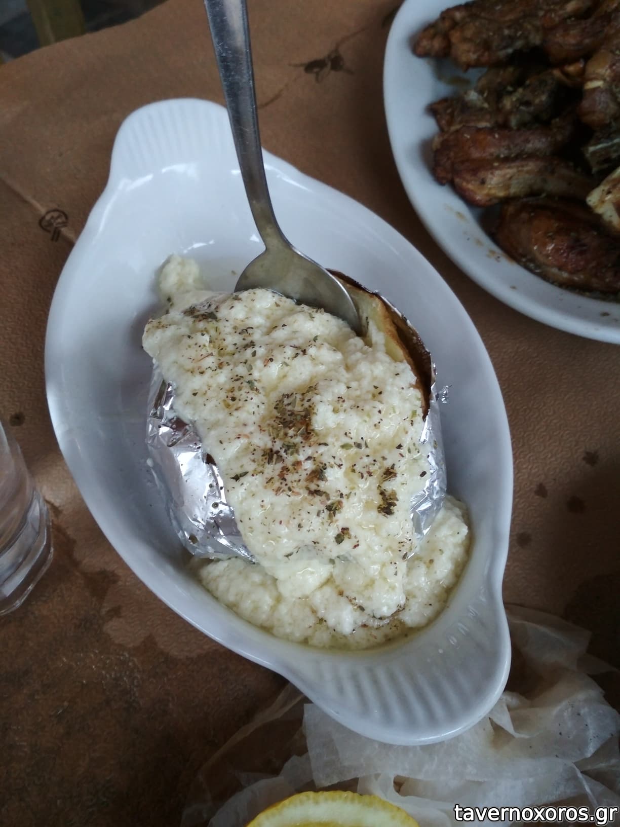 Οφτή πατάτα με στάκα (τη φέρνει χωρίς πολύ αλάτι και προσθέσαμε εμείς - κολασμένο!!)