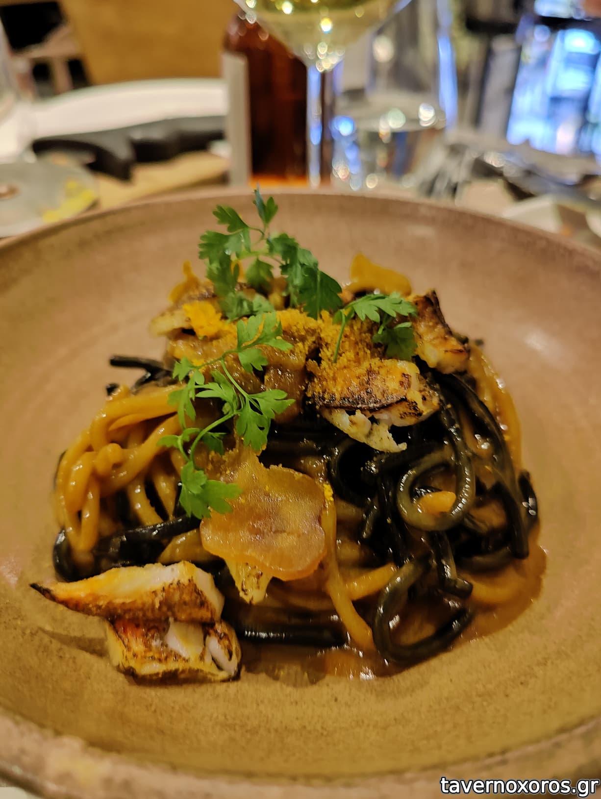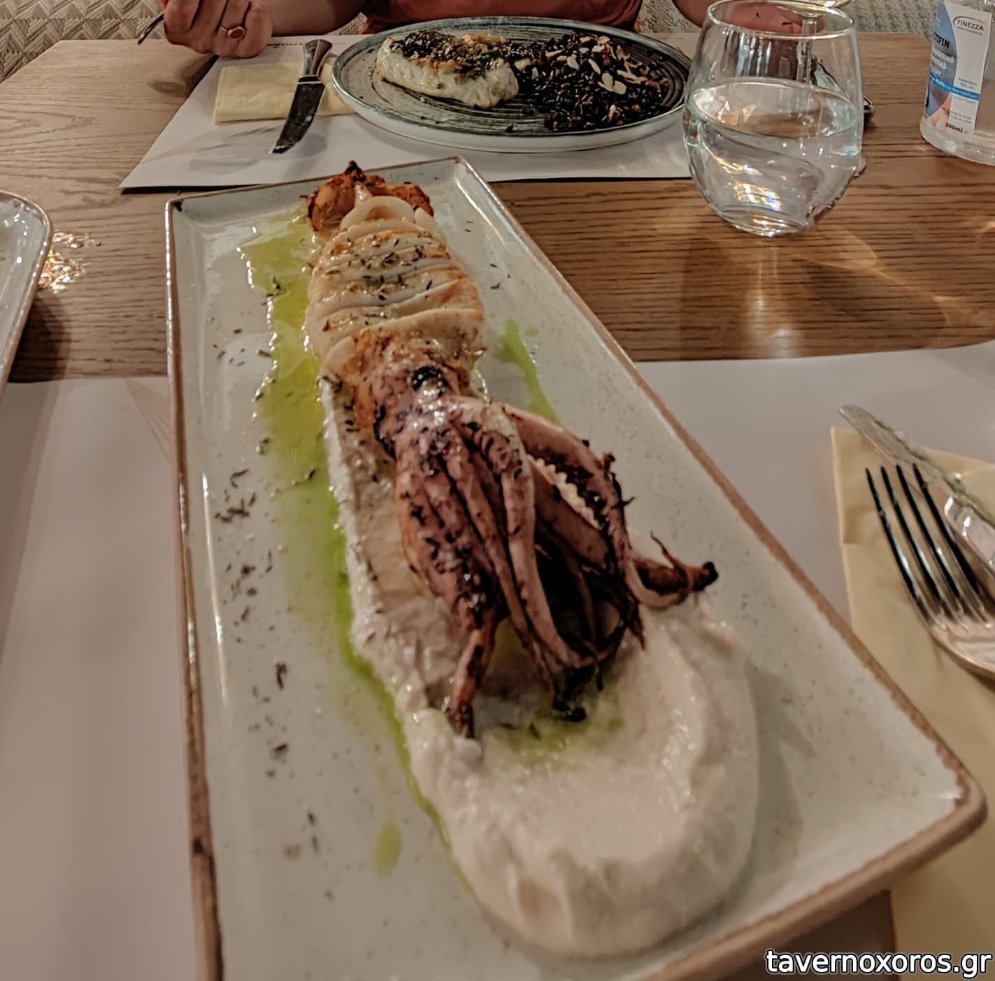 Τίμιο καλαμάρι με μέτριο ταραμά! Και στο βάθος φιλέτο λαυράκι ωραία ψημένο με πολύ μέτριο μαύρο ρύζι.
