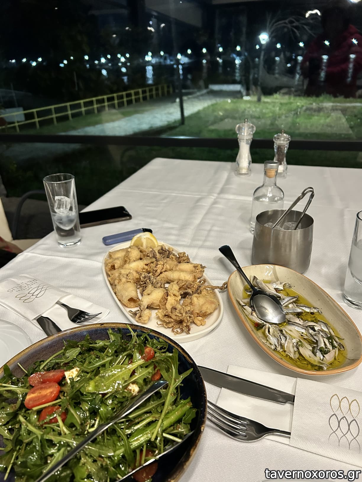 Χαλαρή ατμόσφαιρα ευγενικό σέρβις. Με 2 ποτήρια κρασί ζεστό, πολύ ωραίο για μια κρύα νύχτα του Γενάρη στα έξω τραπέζια, με 2 πιάτα με μπουσκέτες και τορτίγια σολομού, συνοδευτικό με χουρμάδες 32Ε. Γενικά όμορφα...