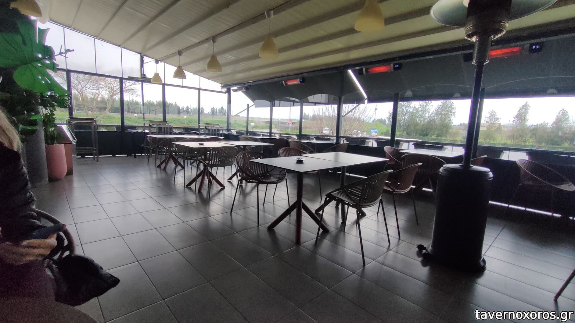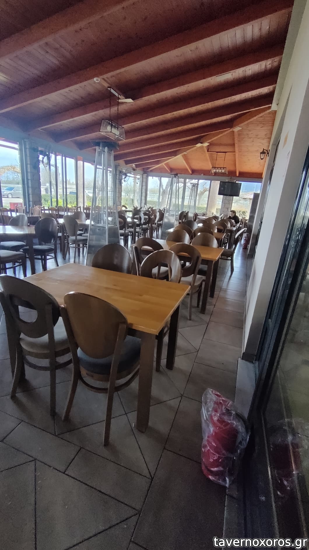 Ο στεγασμένος εξωτερικός ημιυπαιθριος- και σχετικά μικρότερος χώρος- ήταν πλήρης, με ωραία ζέστη μια και λειτουργούσε ενεργειακό τζάκι .